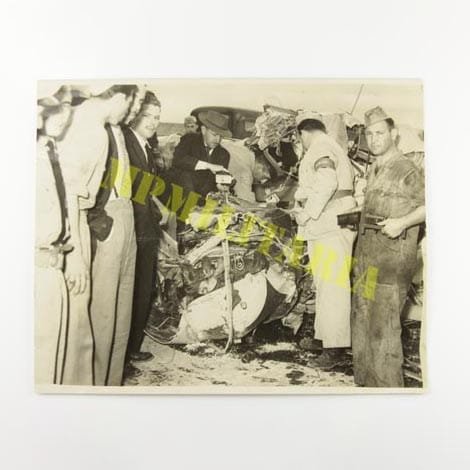Antiga foto de um acidente de avião, com dois militares da FAB e outros. Apresenta inscrição no verso.