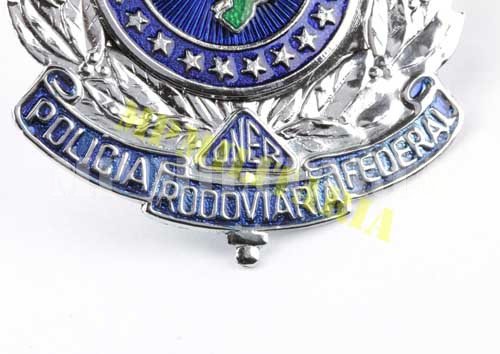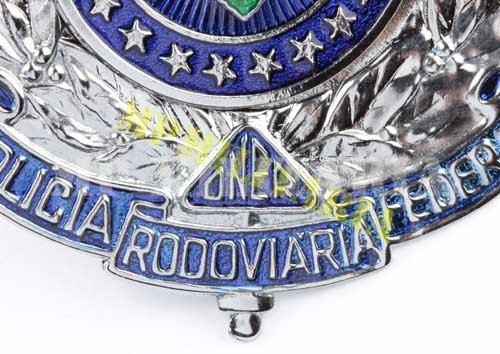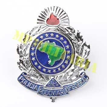 Antiga insígnia de quepe da Polícia Rodoviária Federal – PRF modelo usado até 1990 quando era subordinada ao antigo Departamento Nacional de Estradas de Rodagem DNER, atual Departamento Nacional de Infraestrutura de Transportes (DNIT). Com a publicação da Lei nº 8.028, de 12 de abril de 1990, passou a ser subordinada ao Ministério da Justiça (Brasil). Este distintivo ainda apresenta a sigla “DNER” os atuais são com a legenda “MJ”.