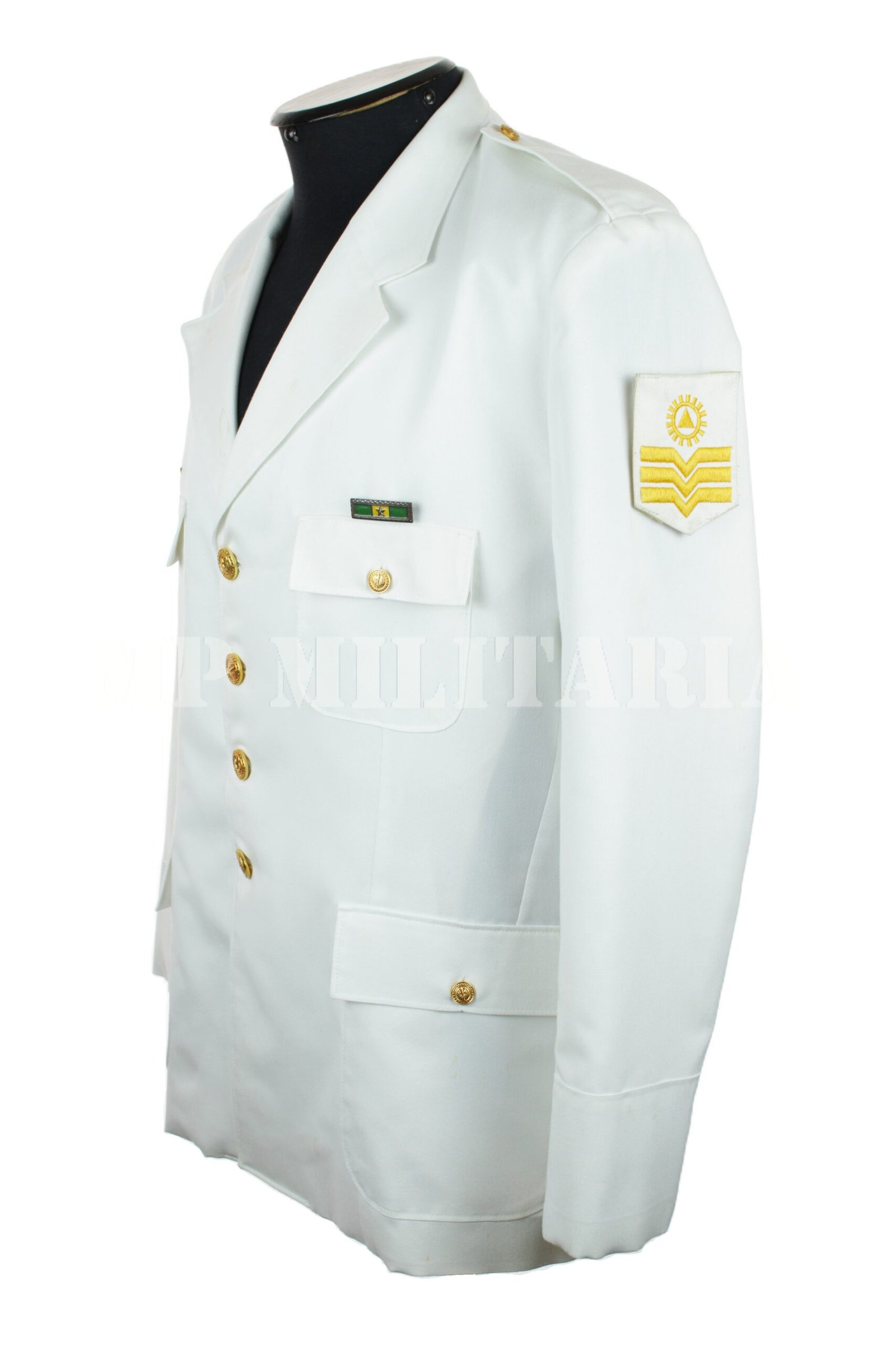 Túnica branca do 4º Uniforme de Terceiro Sargento Especialista da Força Aérea Brasileira – FAB, com distintivo de curso de especialista (dourado) e barreta da medalha de valor militar de 10 anos, com botões dourados;