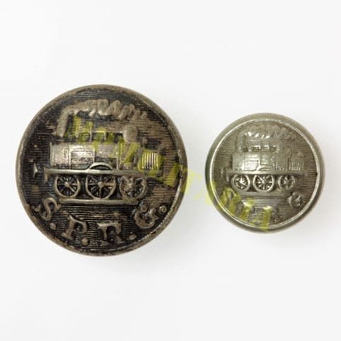 Raro conjunto de botões da Estrada De Ferro São Paulo Rio Grande EFSPRG (1909 – 1942), apresenta uma locomotiva sobre o monograma “S.P.R.G.”. Conjunto composto por um botão grande e outro pequeno.