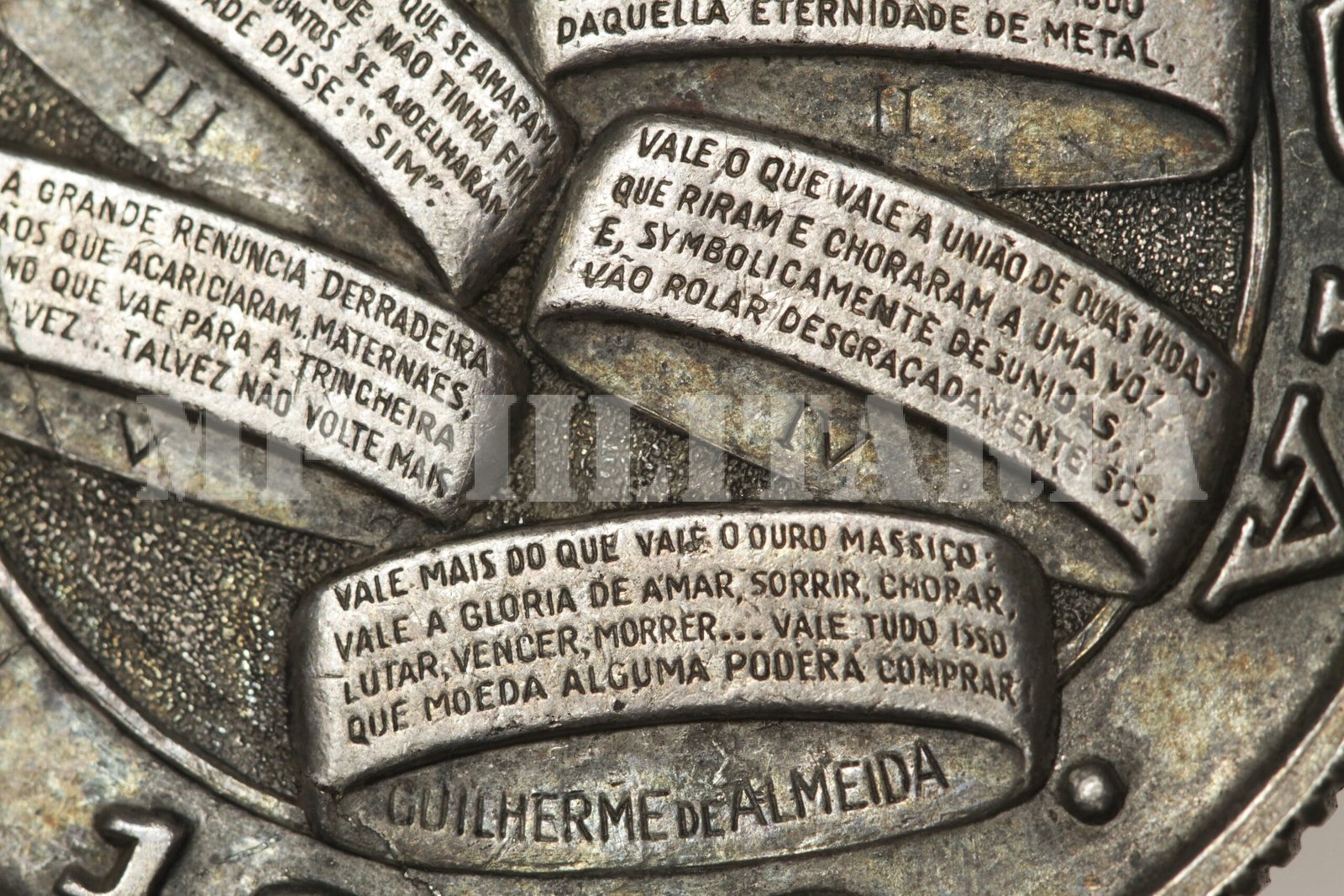 Badge da Moeda Paulista com poema de Guilherme de Almeida “Moeda Paulista” apresenta a numeração baixa “102”, feito para arrecadar fundos durante a Revolução Constitucionalista de 1932, é possível ler o poema estampado na medalha: