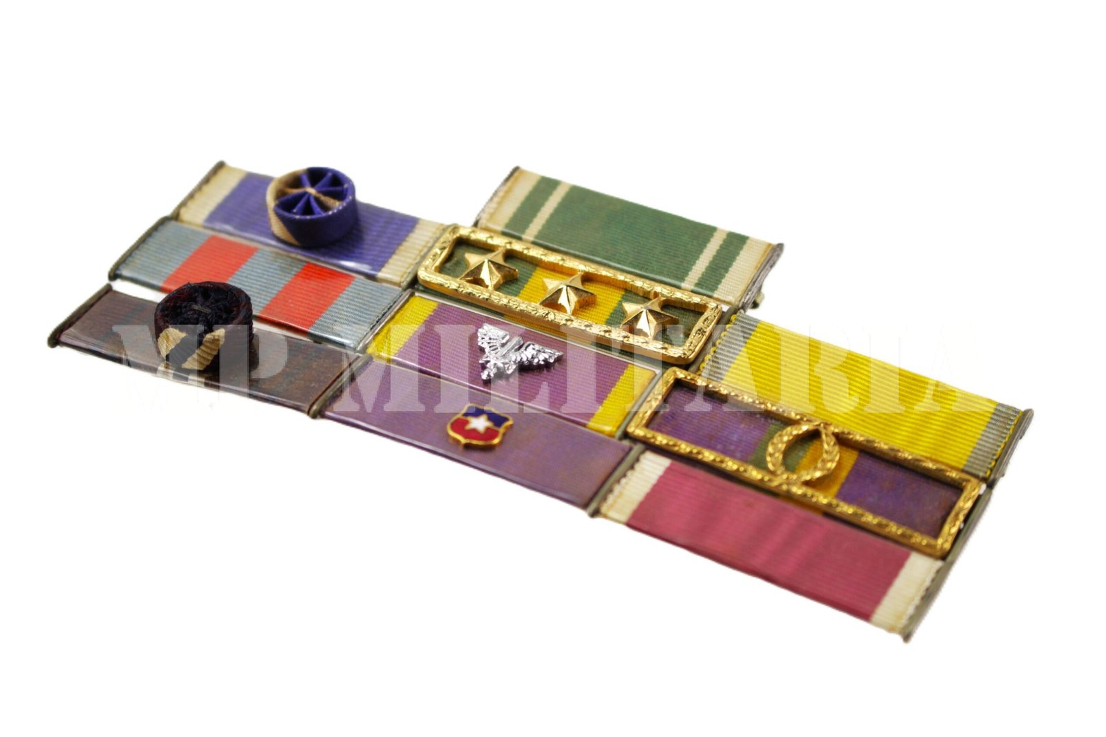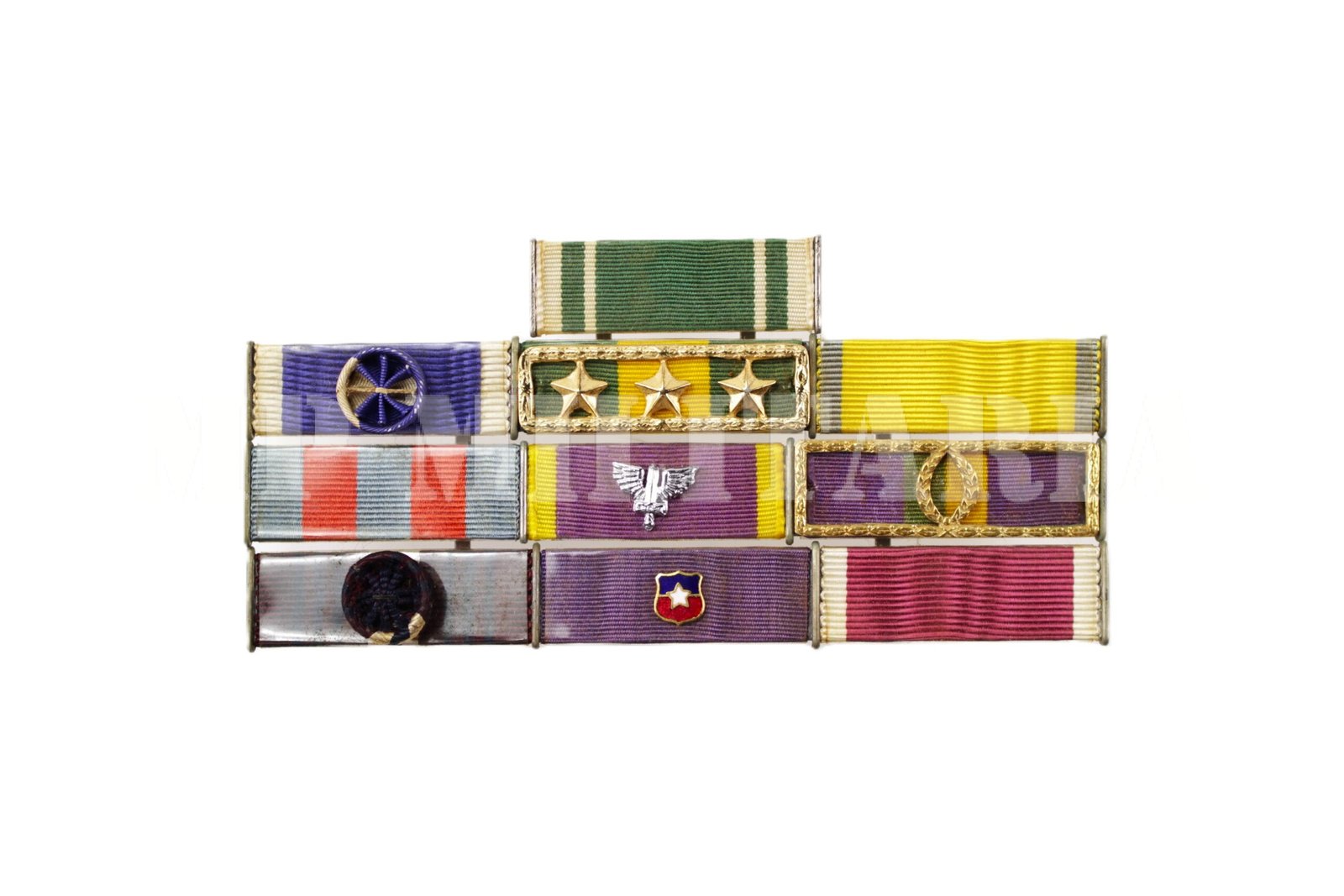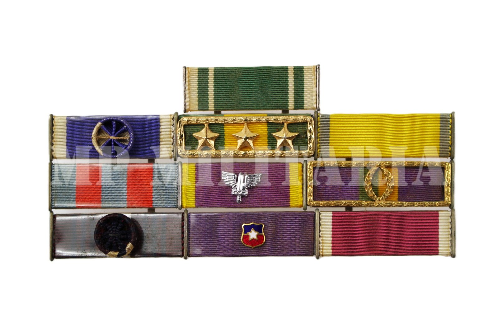 Antigo barrete de um Oficial do Exército Brasileiro, composto por dez (10) barretas, referente as medalhas, Ordem do Mérito Militar, Ordem do Rio Branco, Valor Militar de 30 anos, Medalha de Guerra, Medalha do Pacificador, Mérito Santos Dumont, Marechal Hermes, entre outras;