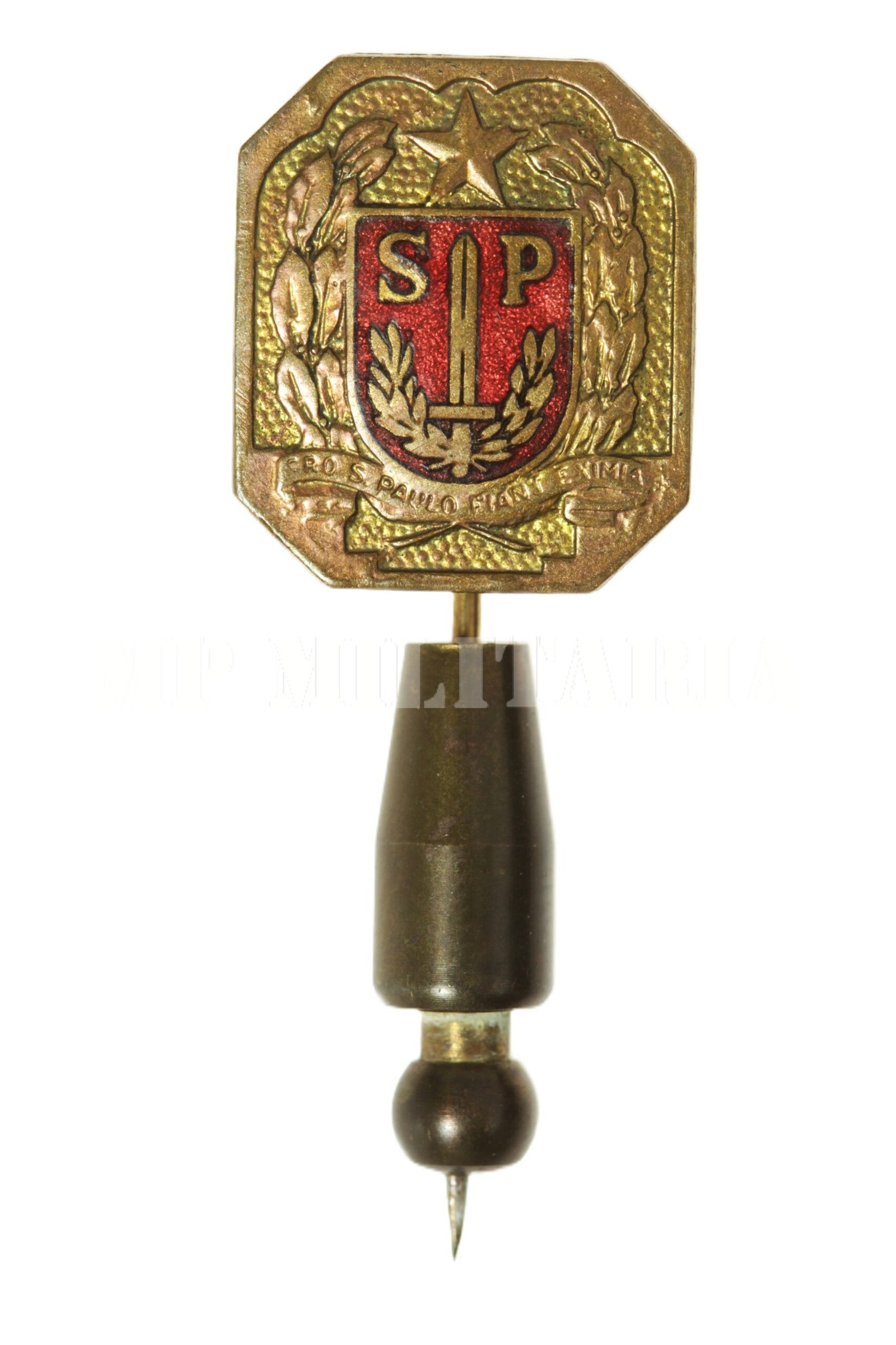 Pin do brasão do Estado de São Paulo, dourado, feito em Portugal durante o Exílio, apresenta a legenda “Pro S. Paulo Fiant Eximia” (Por São Paulo Façam-se Grandes Coisas), da época da Revolução de 1932;