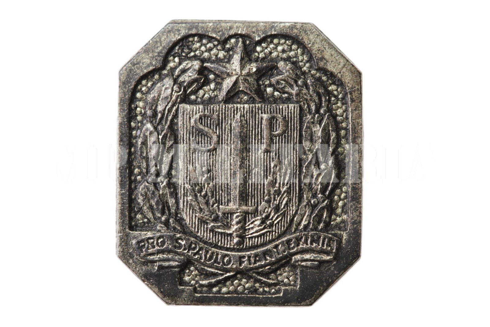 Pin do brasão do Estado de São Paulo feito em Portugal durante o Exílio, apresenta a legenda “Pro S. Paulo Fiant Eximia” (Por São Paulo Façam-se Grandes Coisas), da época da Revolução de 1932;