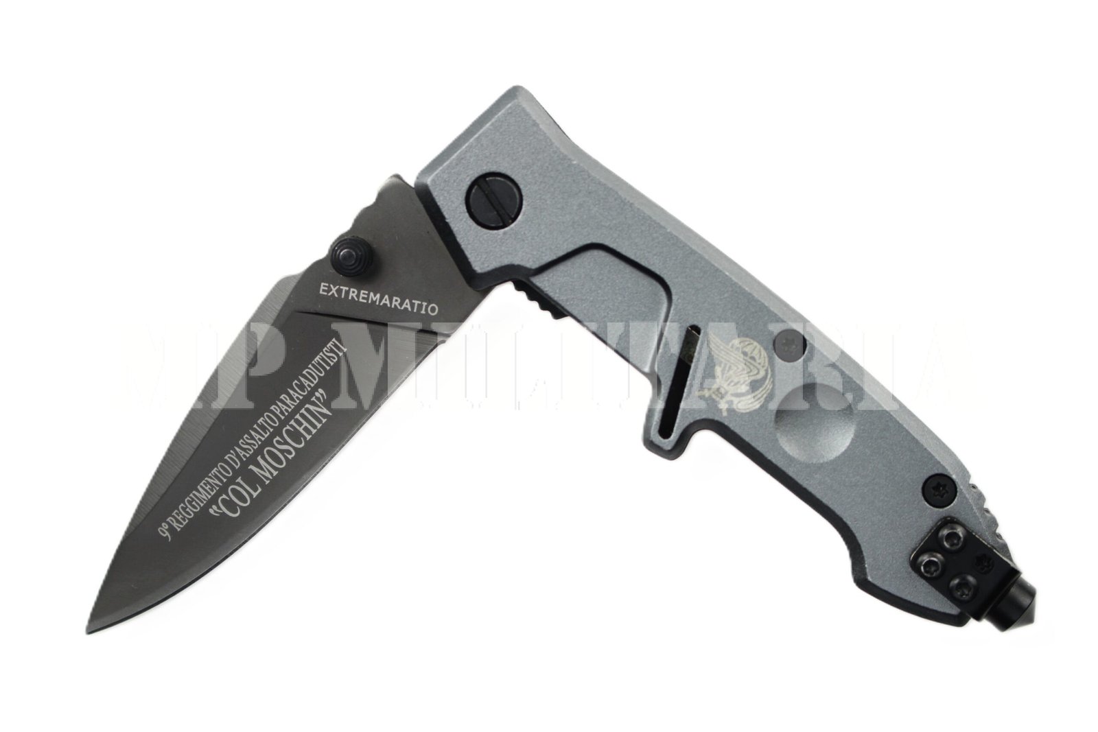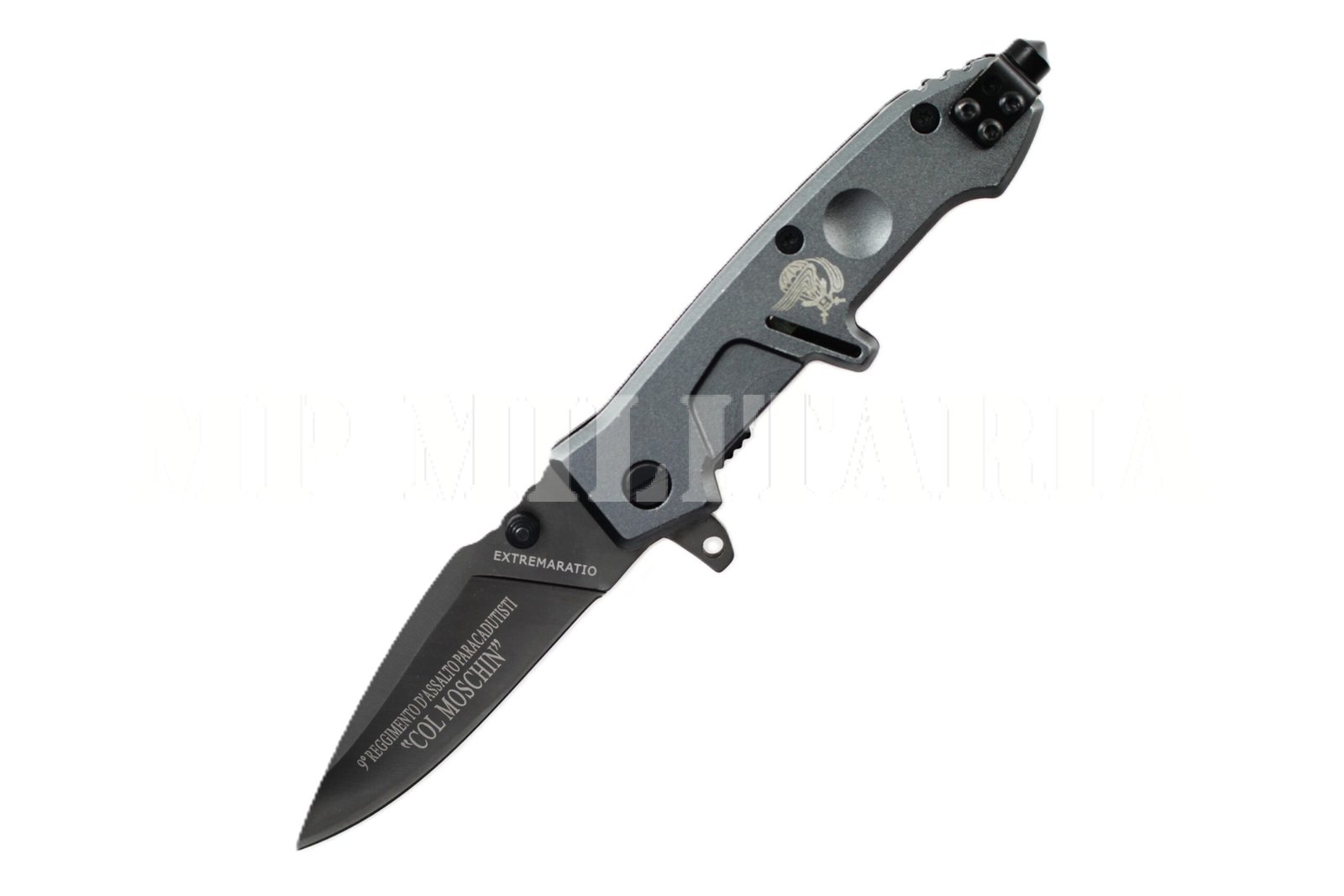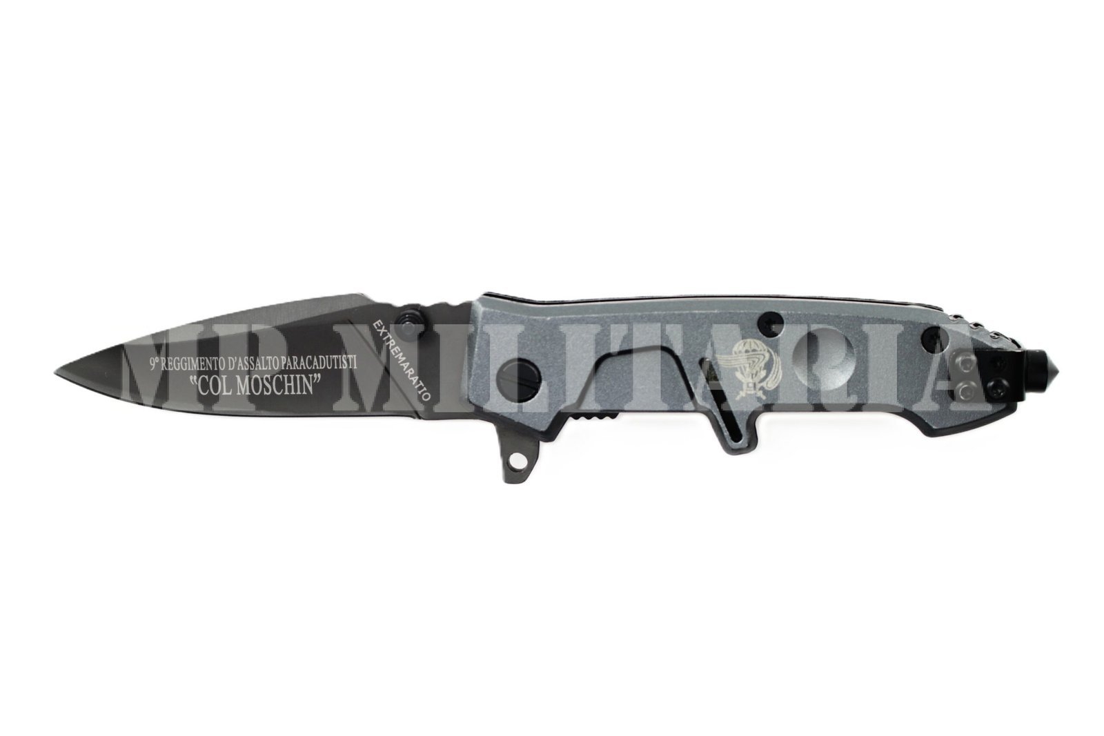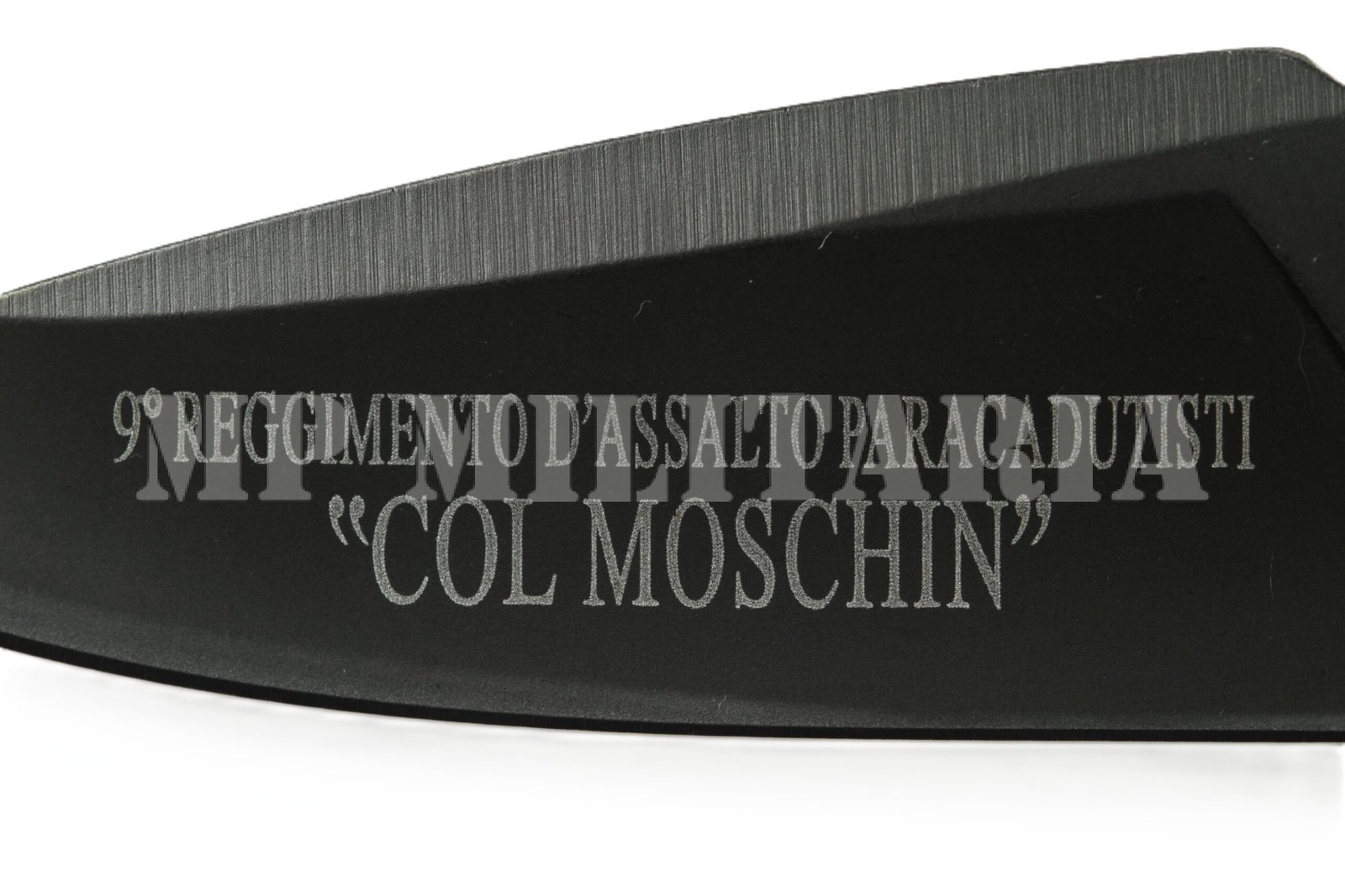 Canivete Italiano com gravação na lâmina do 9º Regimento de Assalto Paraquedista “Col Moschin” (9° Reggimento d’Assalto Paracadutisti) do Exército Italiano;