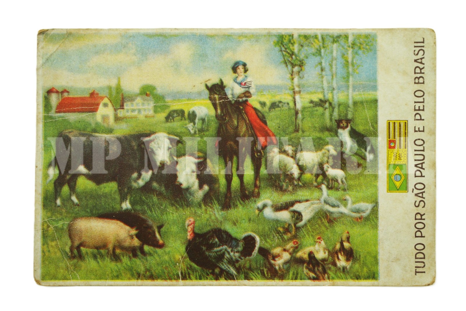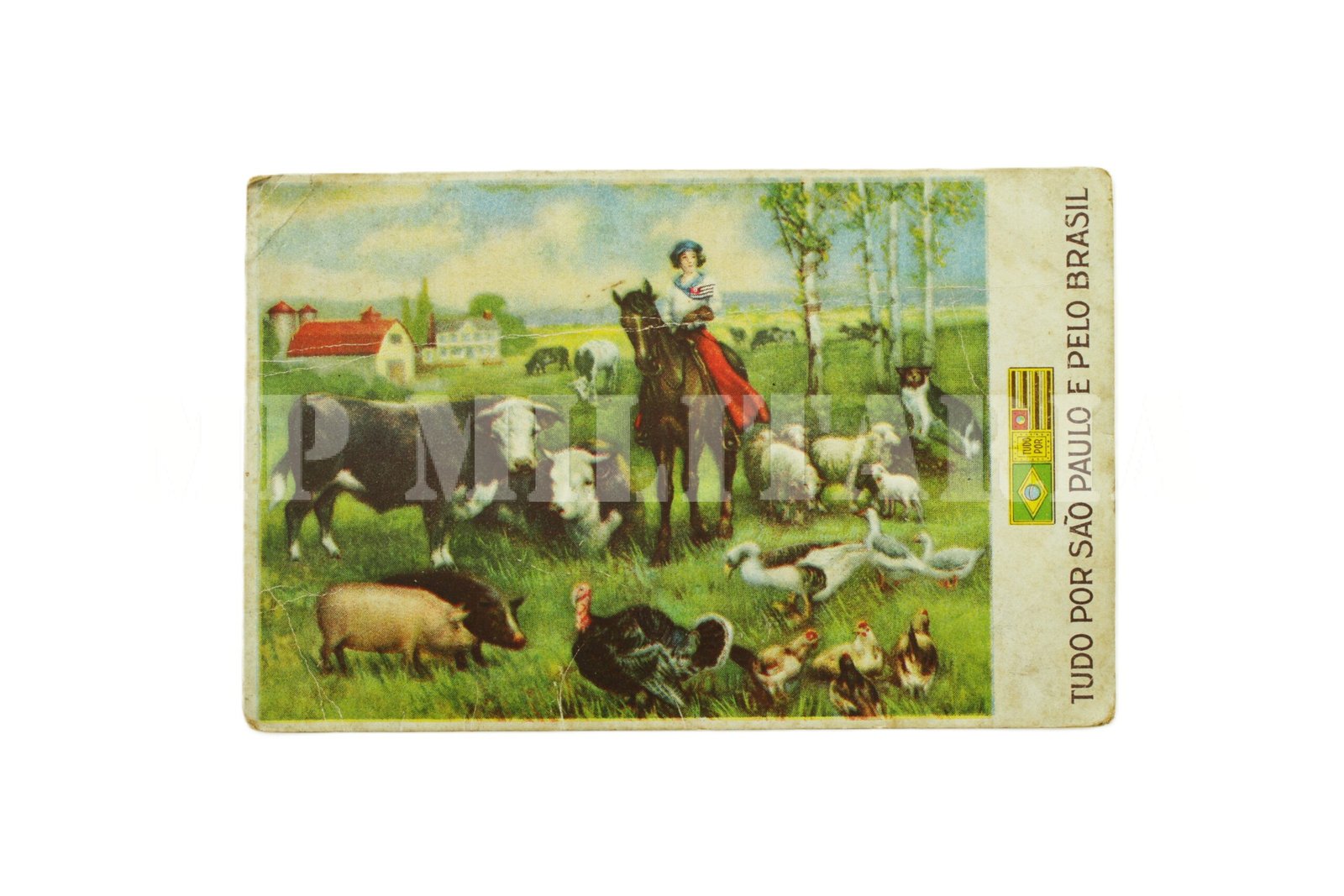 Raro, Cartão postal, da Comissão de Produção Agrícola, da Secretária de Agricultura do Estado de São Paulo, com a inscrição “Tudo de São Paulo e Pelo Brasil”, apresenta a imagem uma cavaleira segurando uma bandeira do estado, entre os animais;