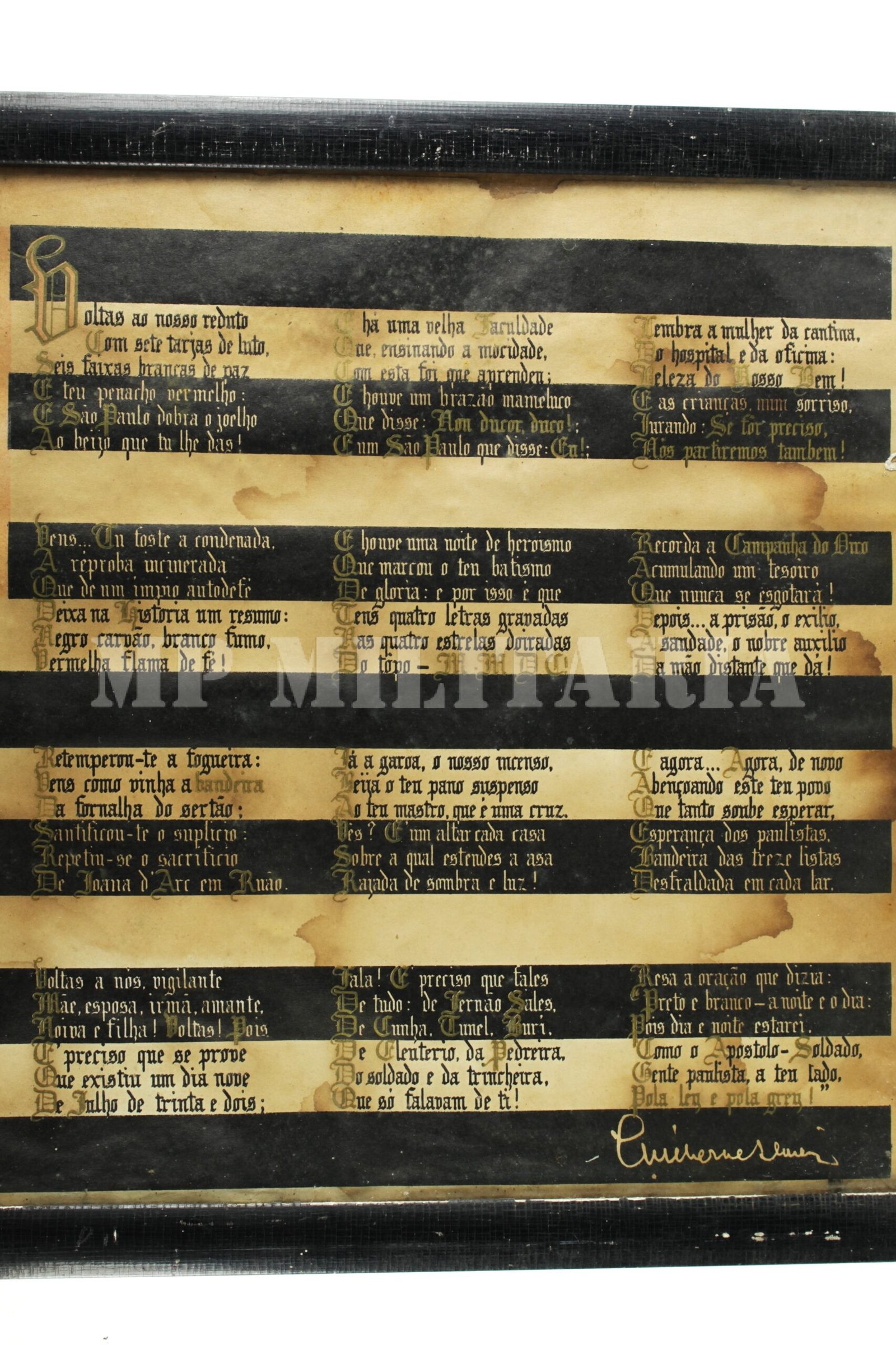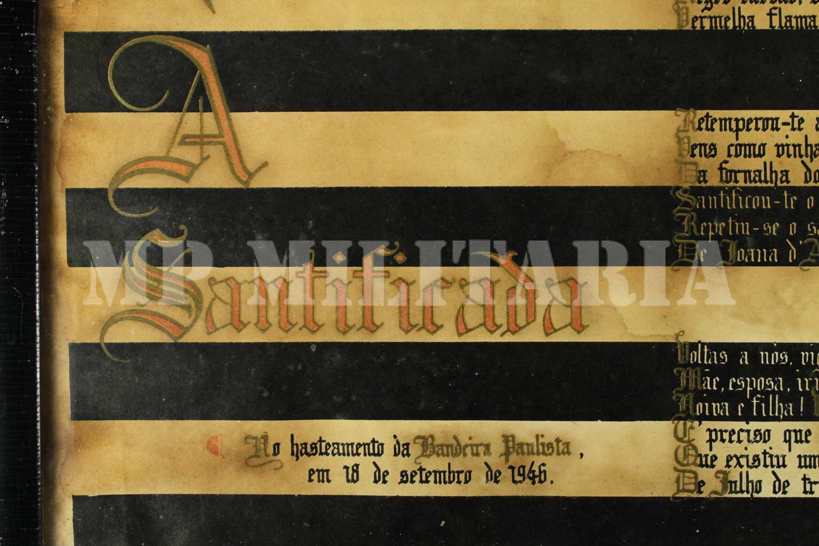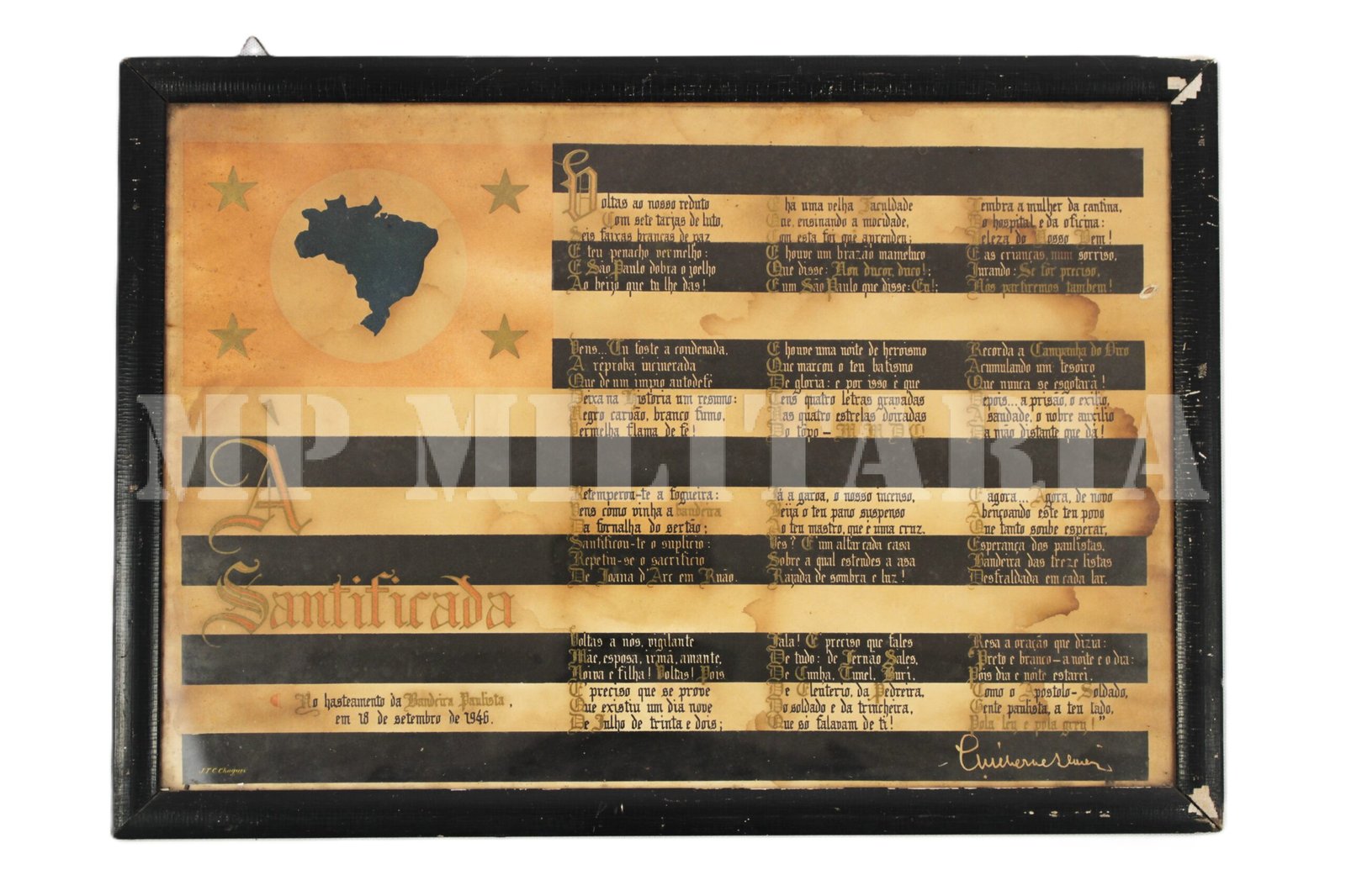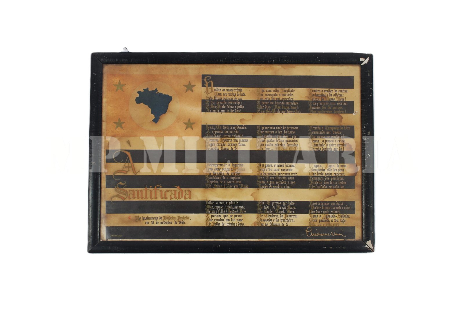 Cartaz emoldurado com o poema “À Santificada”, sobre a bandeira de São Paulo, feito por ocasião do fim do Estado Novo, e Restauração dos Símbolos Estaduais. A Constituição de 1946 revogou a proibição imposta em 1937, permitindo que os estados brasileiros voltassem a utilizar suas próprias bandeiras e brasões;