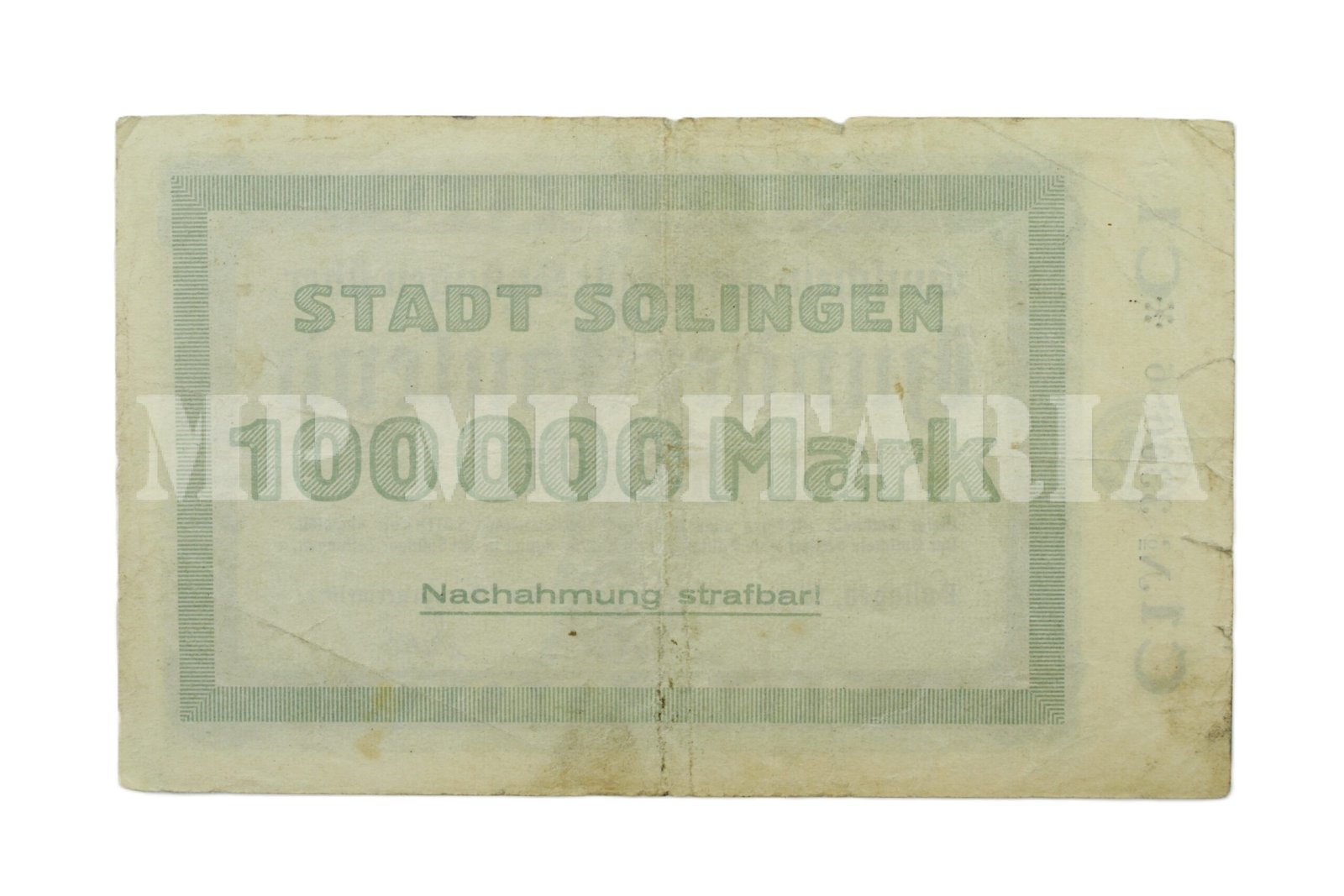 Cédula de 100.000,00 de marcos “Hunderttausend Mark”, emitida no estado de Solingen em1923, durante a República de Weimar (1918 – 1933), época de inflação alta devido as condições impostas pelo Tratado de Versalhes, que limitavam as possibilidades de ressurgimento econômico;