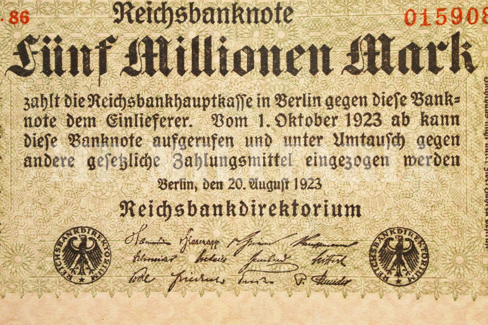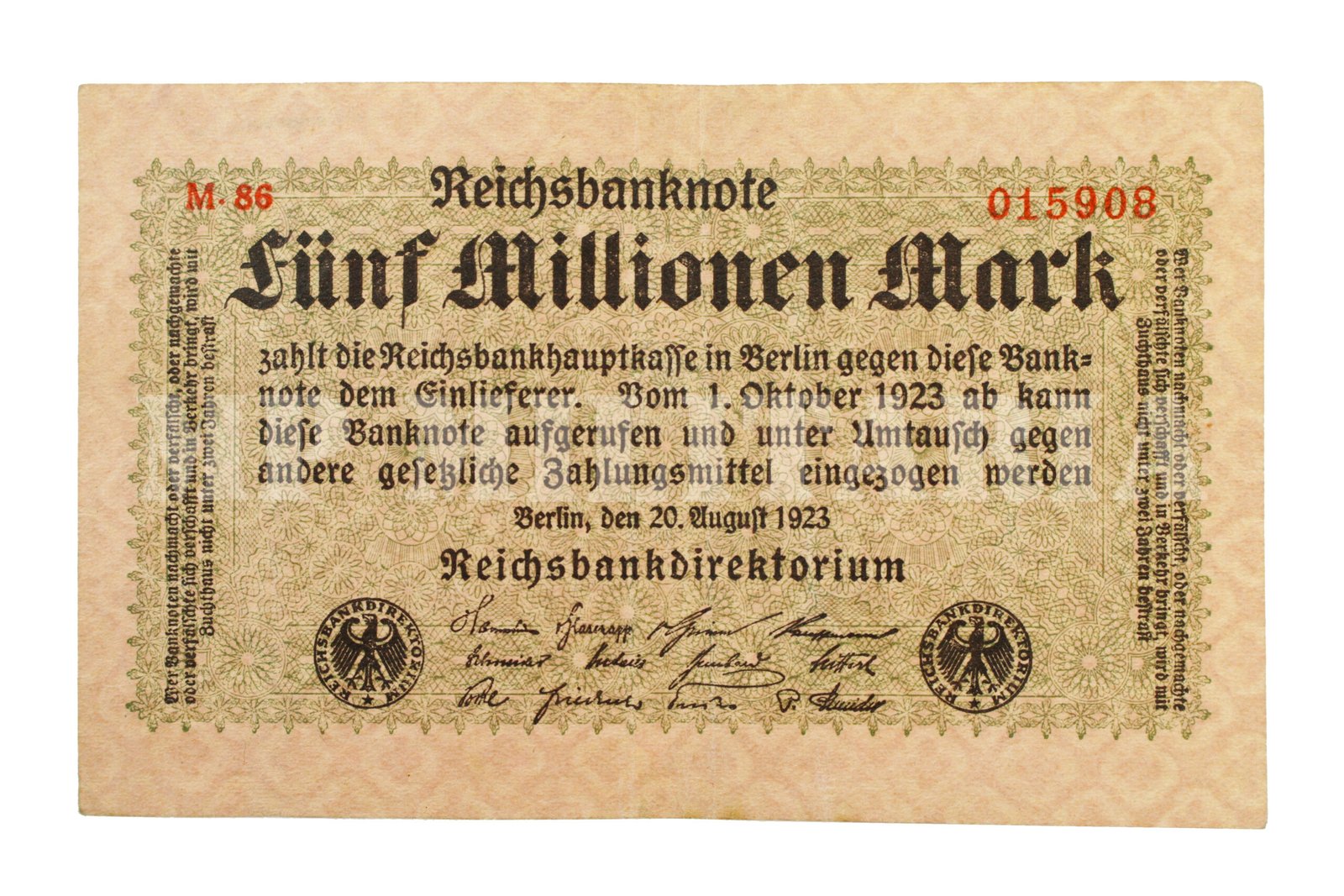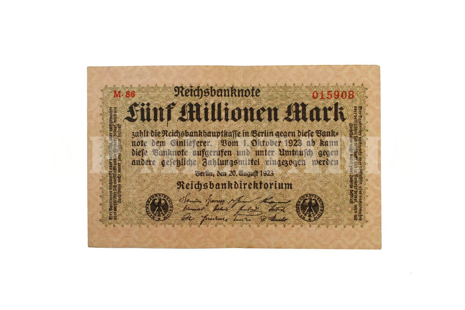 Cédula de 5.000.000,00 de marcos “Fünf Millionen Mark” emitida em 1923 durante a República de Weimar (1918 – 1933), época de inflação alta devido às condições impostas pelo Tratado de Versalhes, que limitavam as possibilidades de ressurgimento econômico;