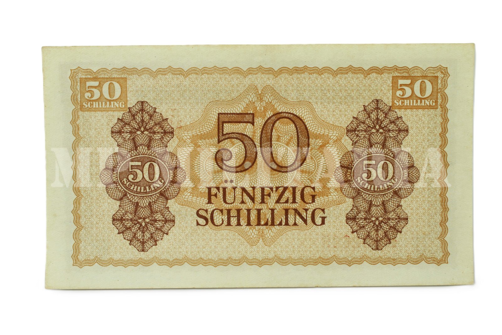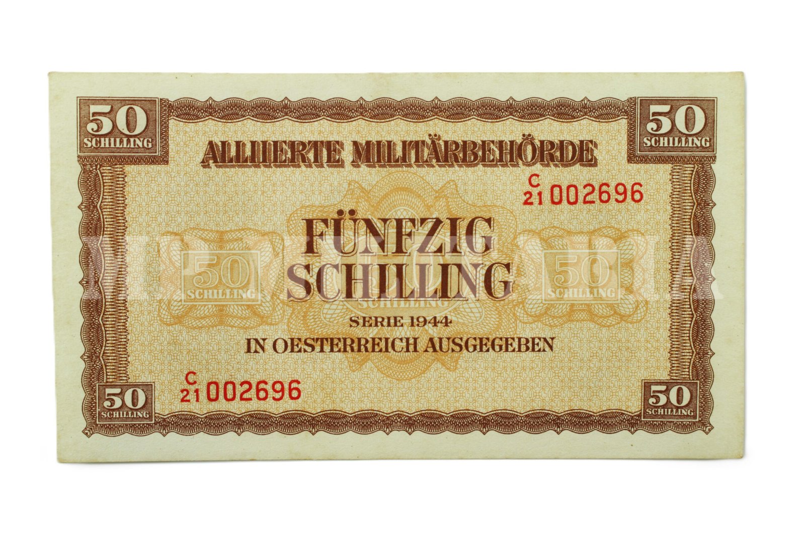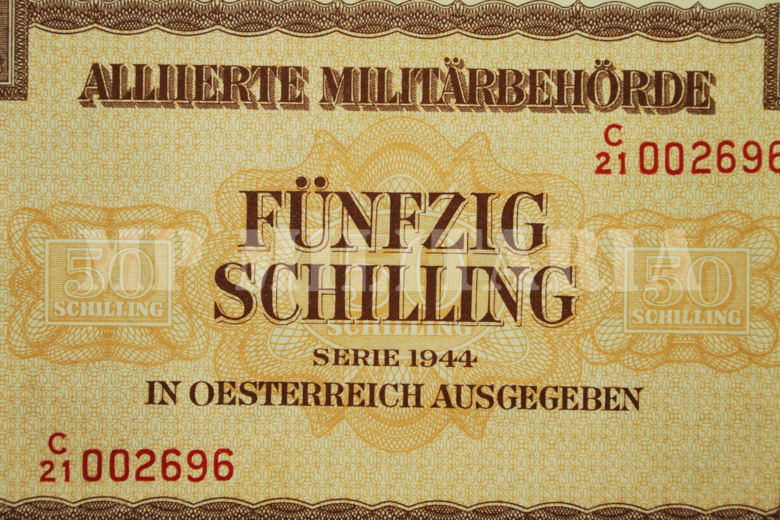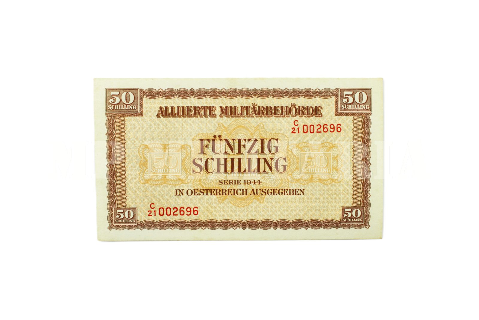 Cédula de ocupação da Aústria “Österreich” de 50 Schilling, emitida em 1944 “Alliierte Militärbehörde” durante a II Guerra Mundial;