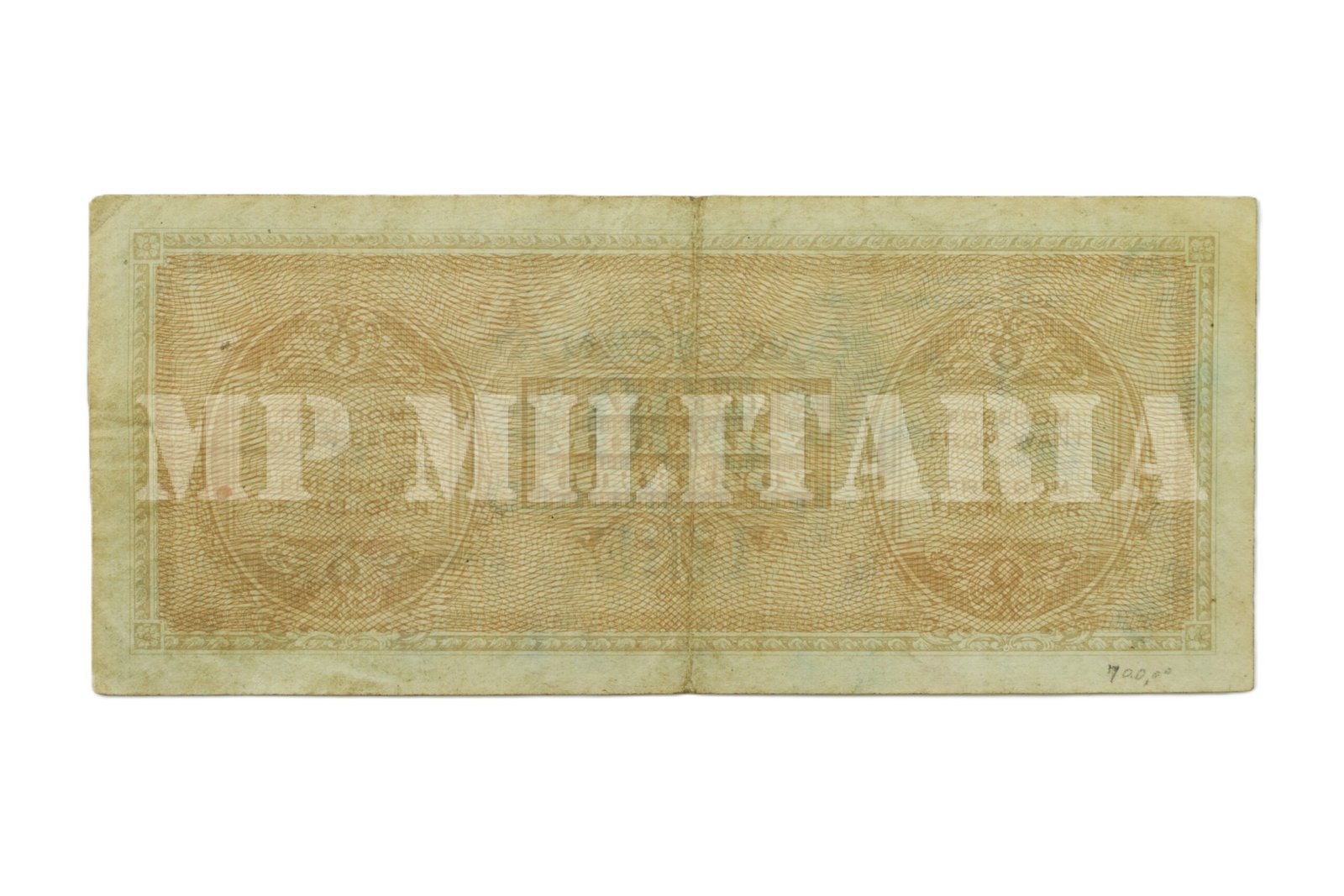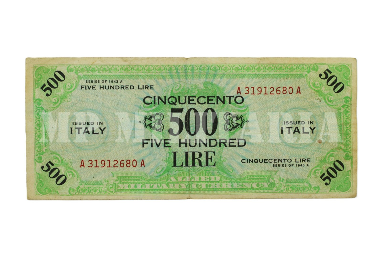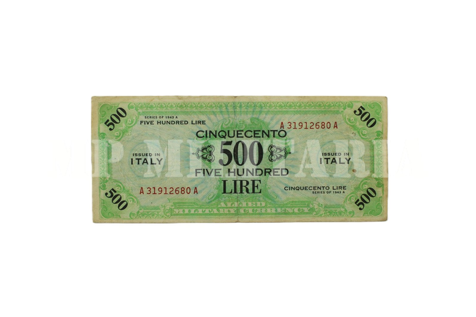 Cédula de ocupação emitido durante a II Guerra Mundial pelas forças aliadas na Itália no valor de 500 Liras “Cinquecento – Five Hundred Lire”, dinheiro usado pela FEB durante a campanha na Itália;