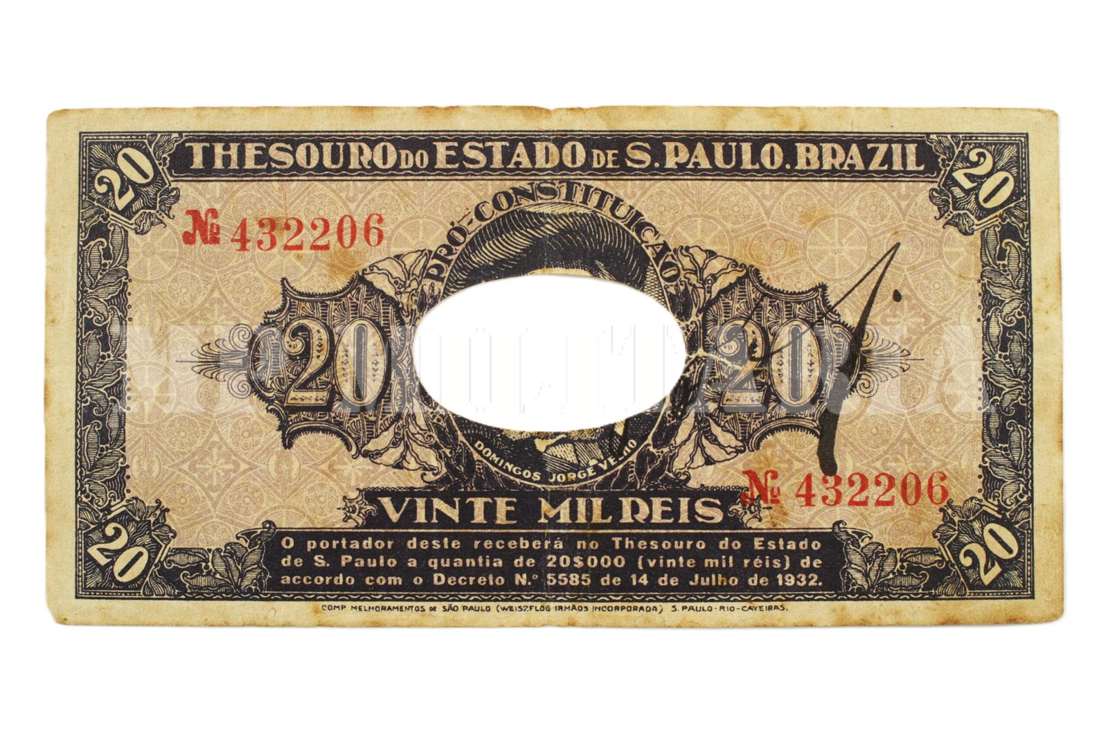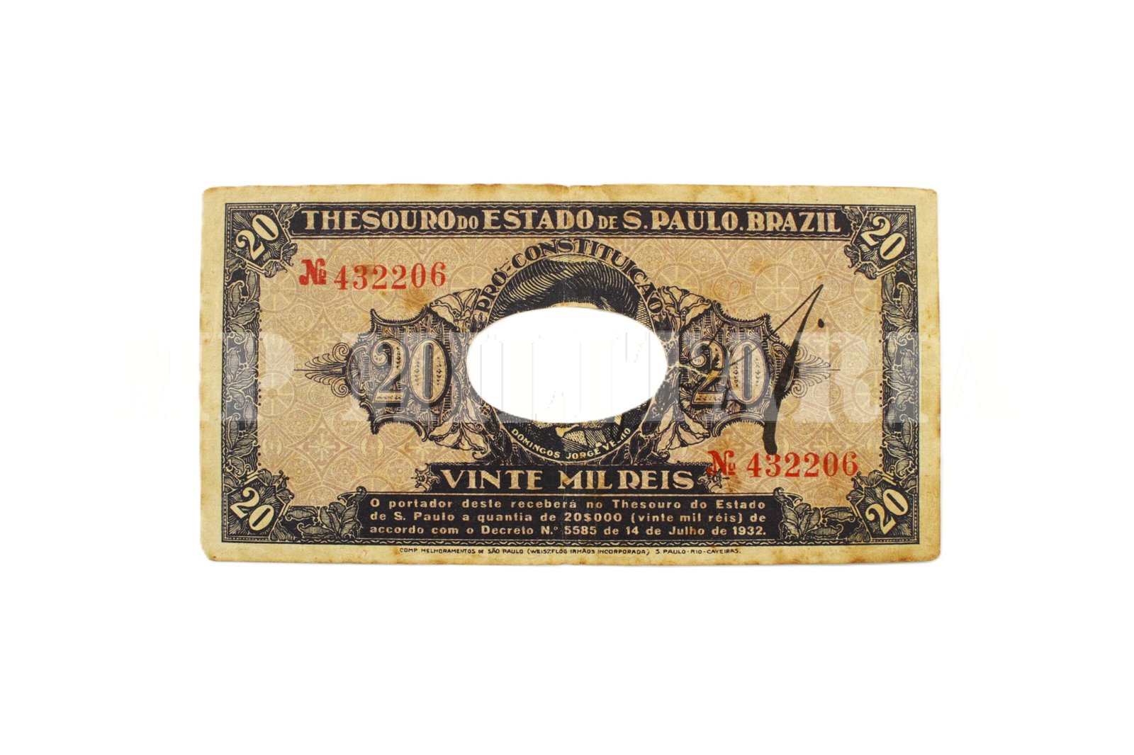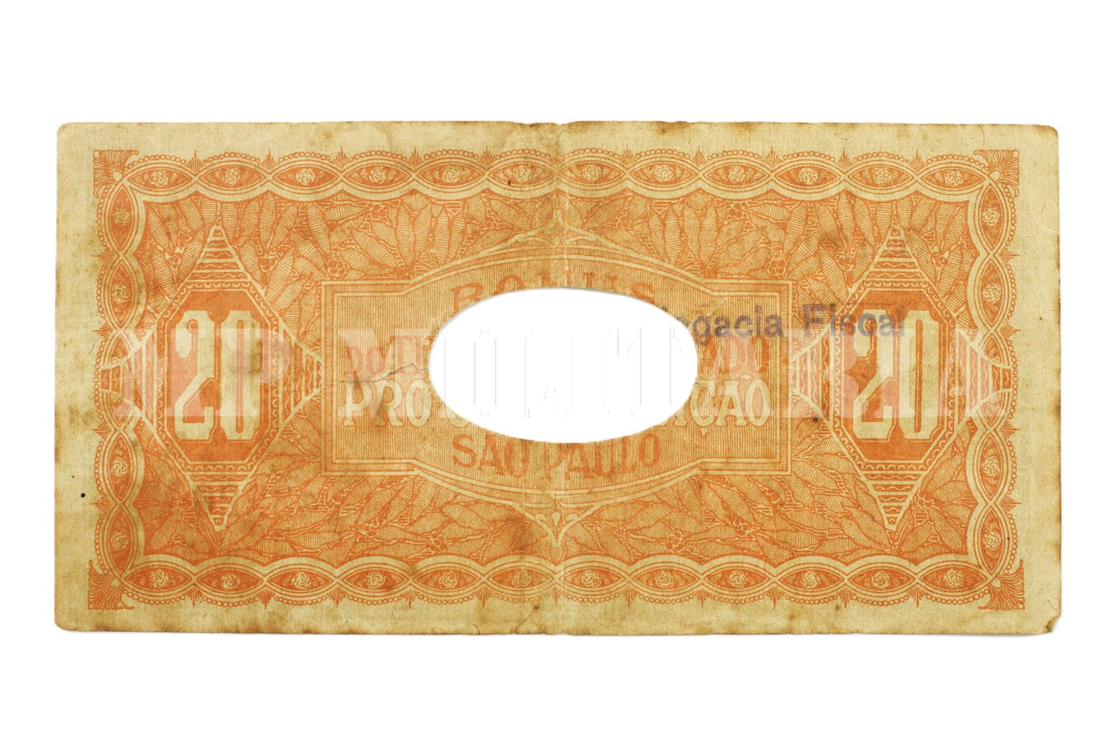 Cédula de 20 mil Reis do “Thesouro do Estado de São Paulo”, a cédula foi resgatada e cancelada (conforme o orifício central) com carimbo da Delegacia Fiscal, impressa durante a Revolução de 1932;