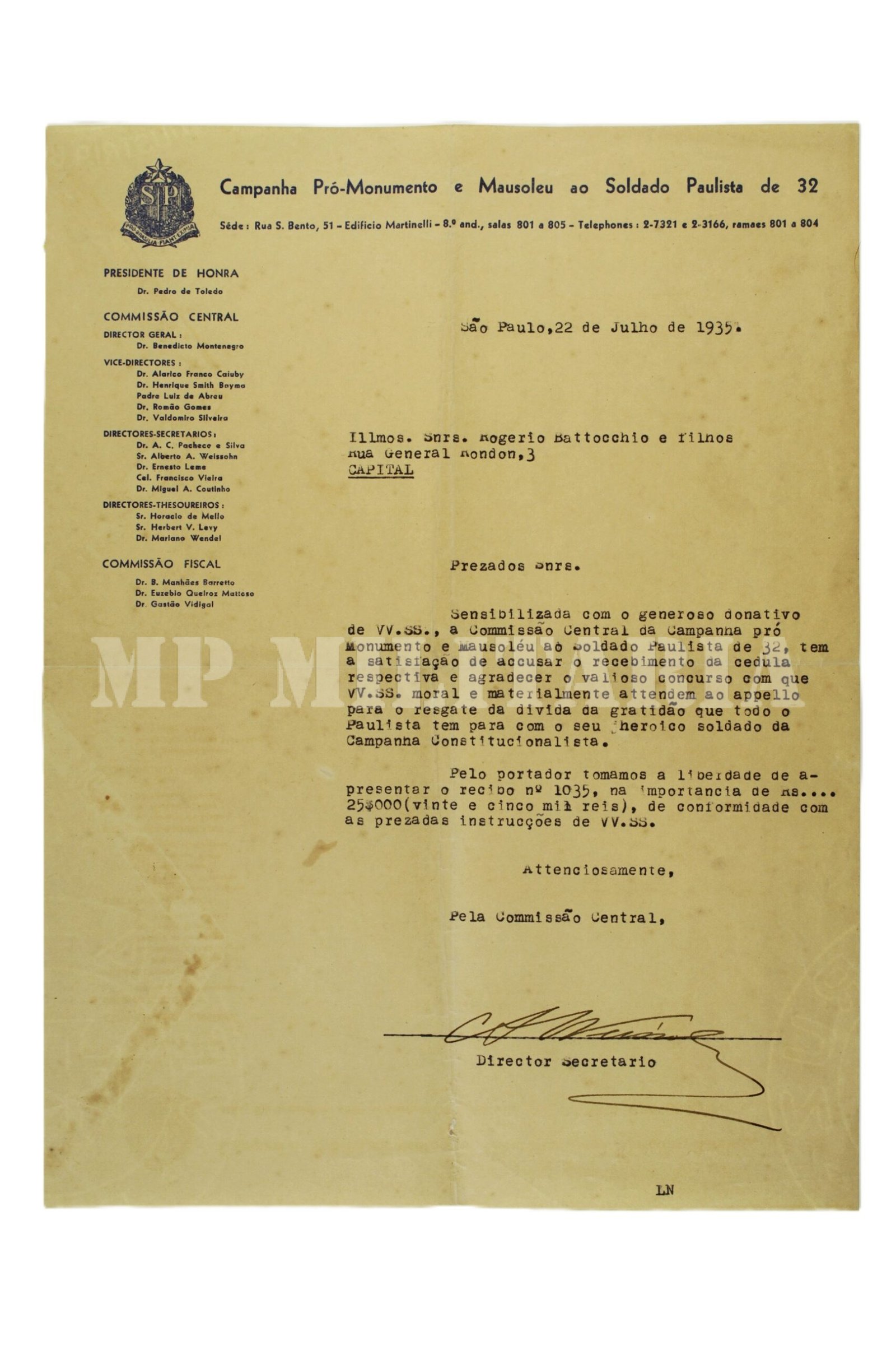 CONJUNTO DE DOCUMENTOS DOAÇÃO DA CAMPANHA PRO MAUSOLÉU DO SOLDADO PAULISTA DE 1932 – OBELISCO