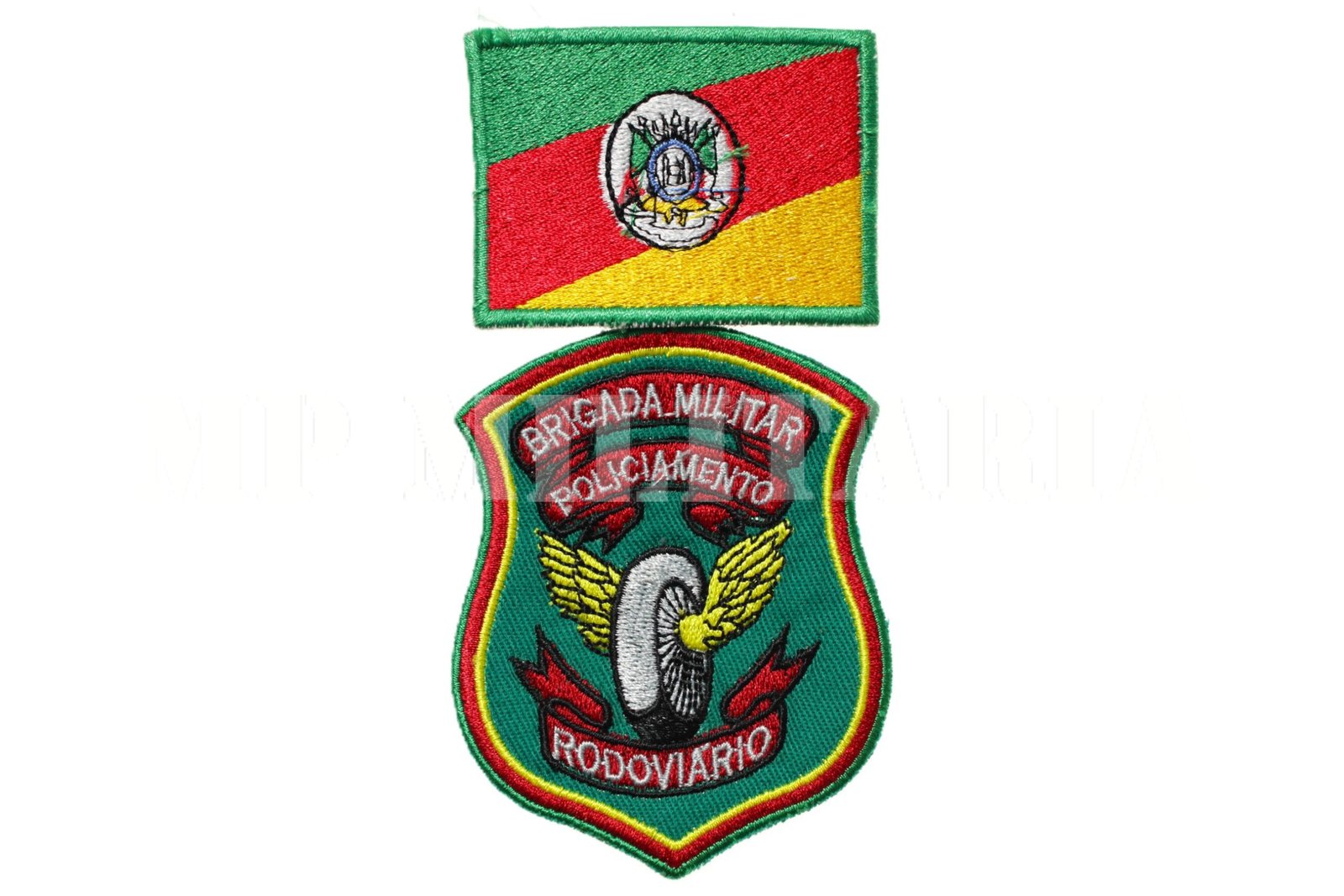 Conjunto de insígnias / Patches do Policiamento Rodoviário da Brigada Militar do estado do Rio Grande do Sul, composto pela bandeira do estado e o símbolo da unidade;