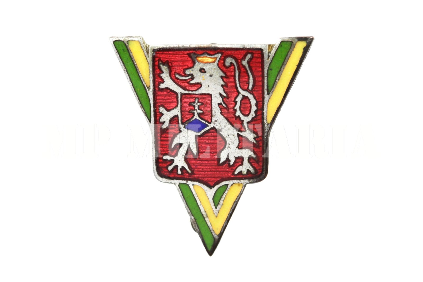 Conjunto de pins da colônia de imigrantes da Tchecoslováquia no Brasil, com um V da vitória verde e amarelo com o brasão tcheco no centro;