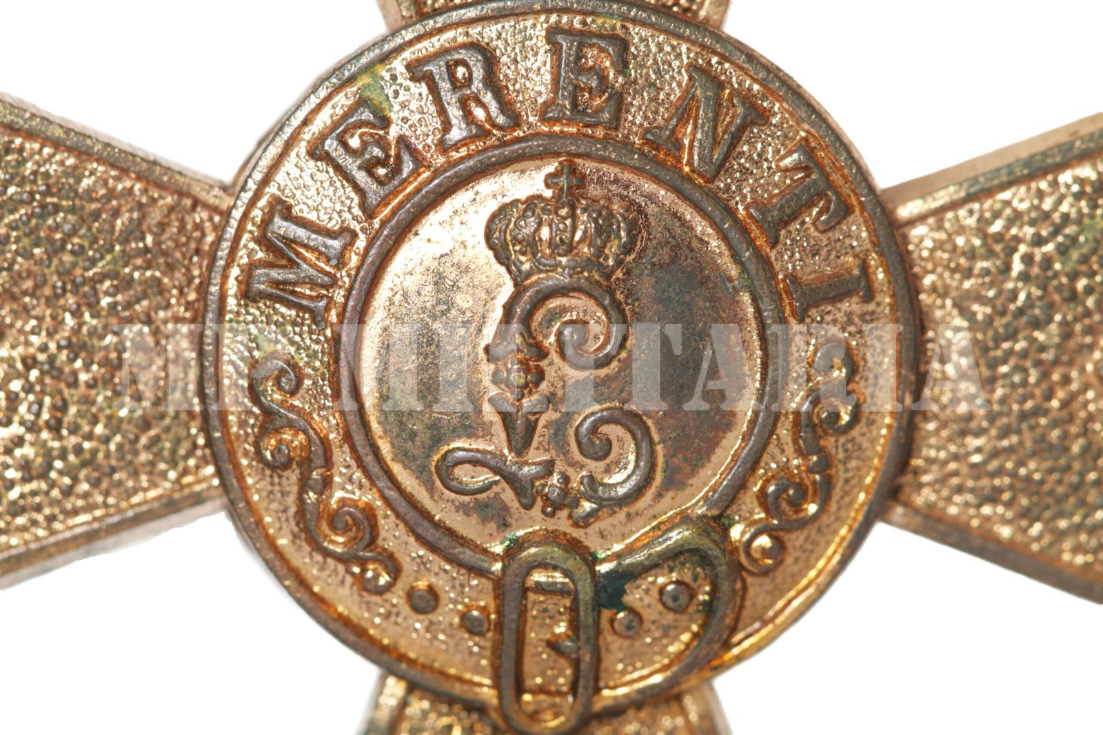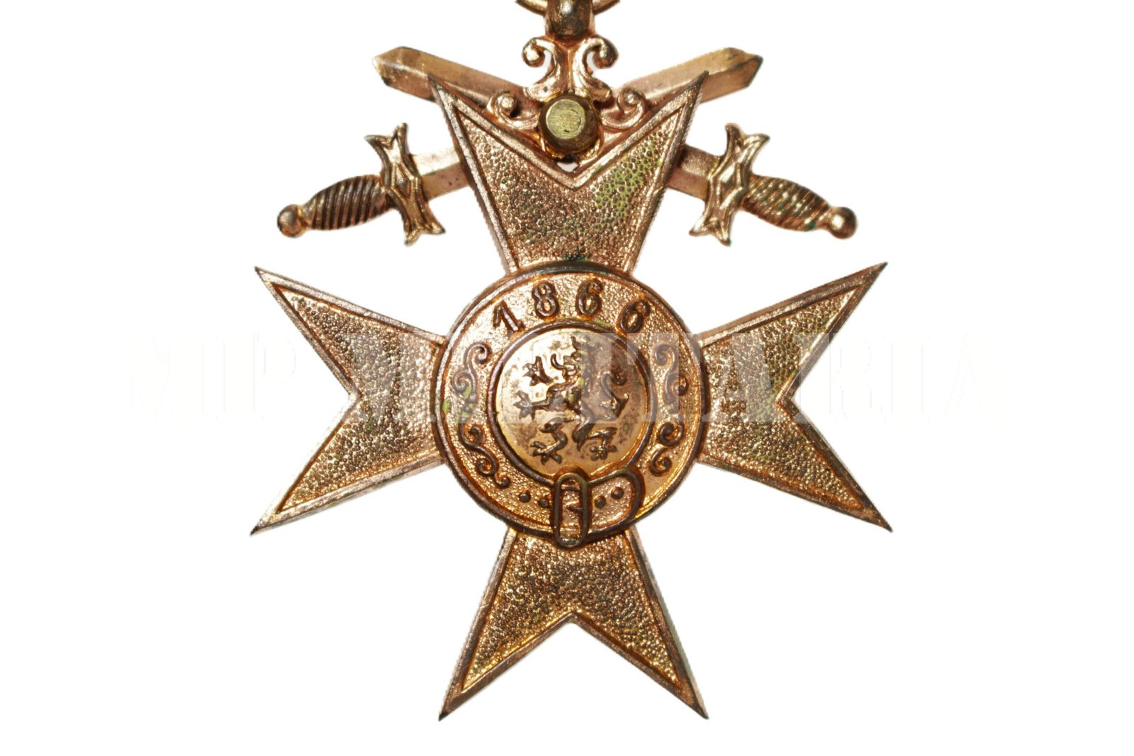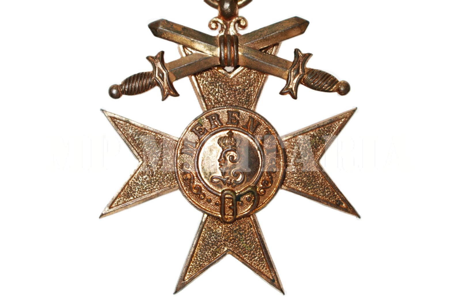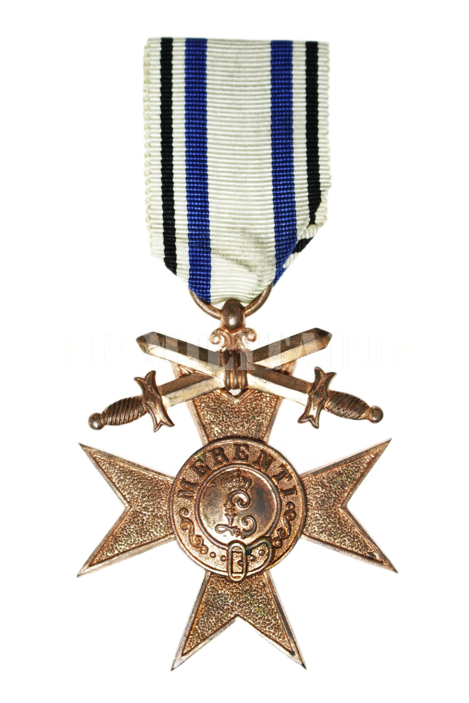 Cruz de Mérito de Guerra da Bavária de 3ª Classe com espadas para combatente “BAYERN. Militär-Verdienstkreuz, III. Klasse mit Schwertern, am Kämpferband”, equivalente a Cruz de Ferro. A medalha foi instituída pelo Rei Ludwig III em 19 de julho de 1866 para mérito extraordinário, em 1905 seu decreto foi revisado e tornou-se a Cruz de Mérito Militar, em 1913 teve sua última revisão e foi destituída em 1918, foi a principal medalha de bravura da Bavária;