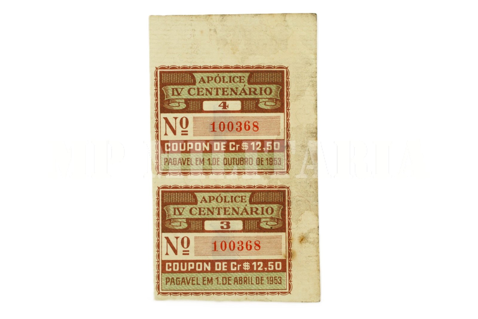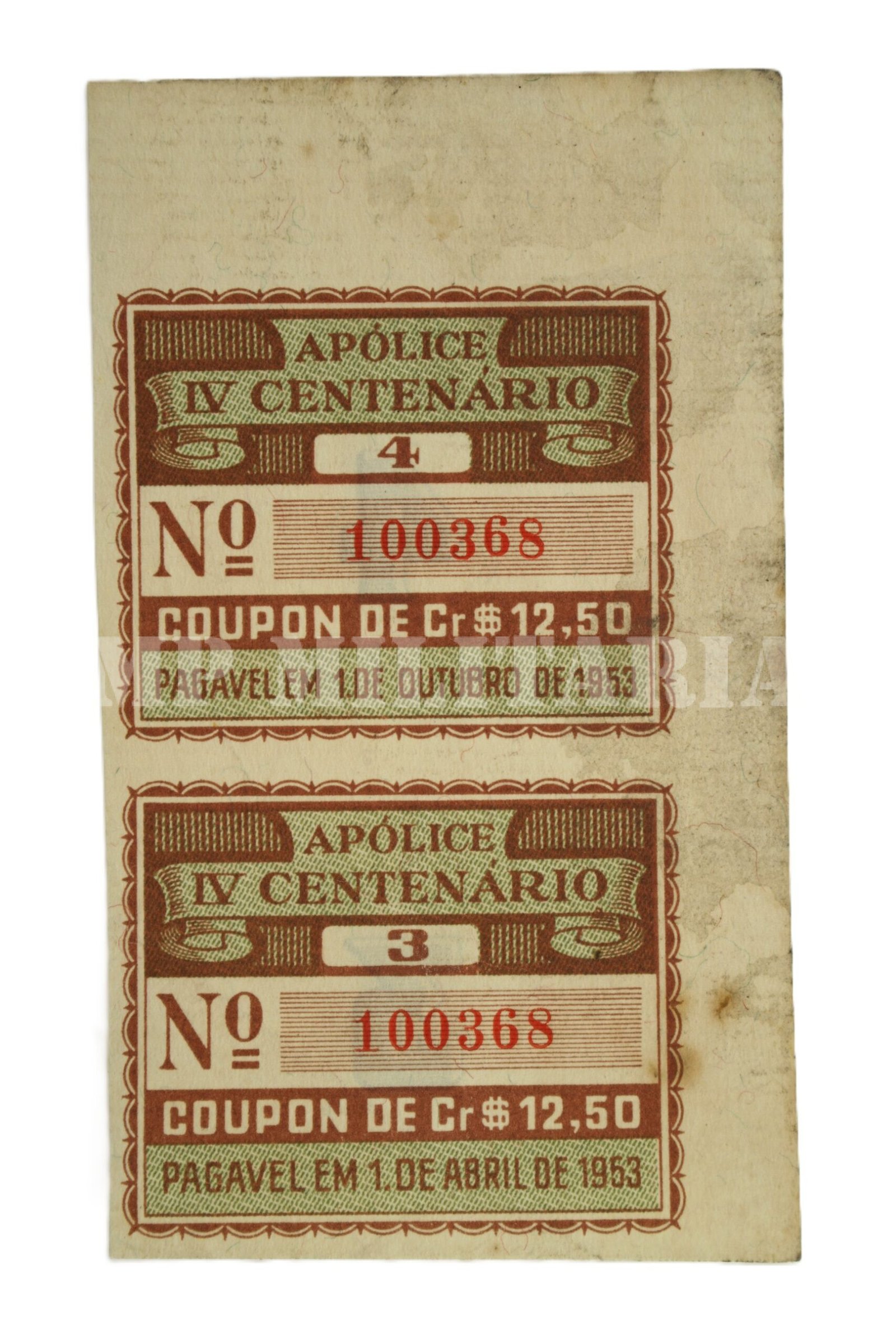 Dois cupons da Apólice IV Centenário da cidade de São Paulo;
