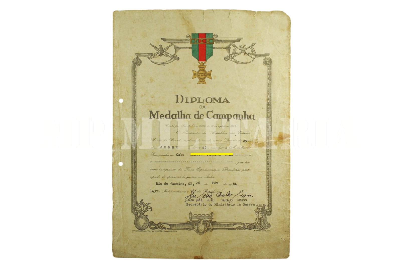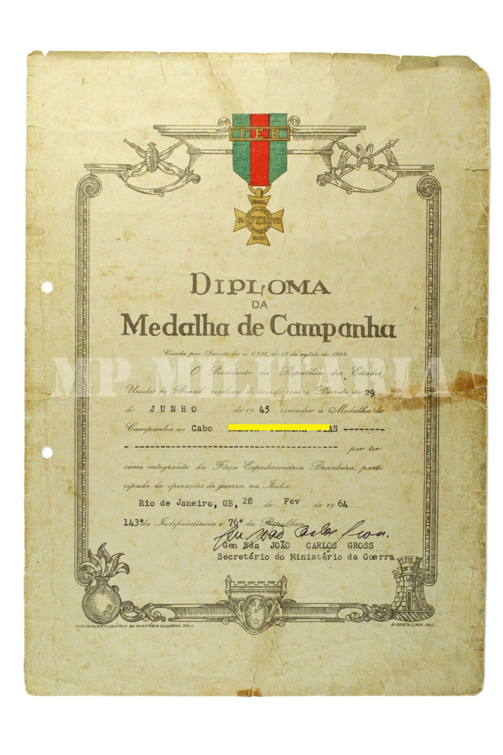 Diploma da “Medalha de Campanha” de um Cabo da FEB – Força Expedicionária Brasileira, II Guerra Mundial. O documento é assinado pelo então Secretário do Ministério da Guerra General João Carlos Gross (também ex-combatente);