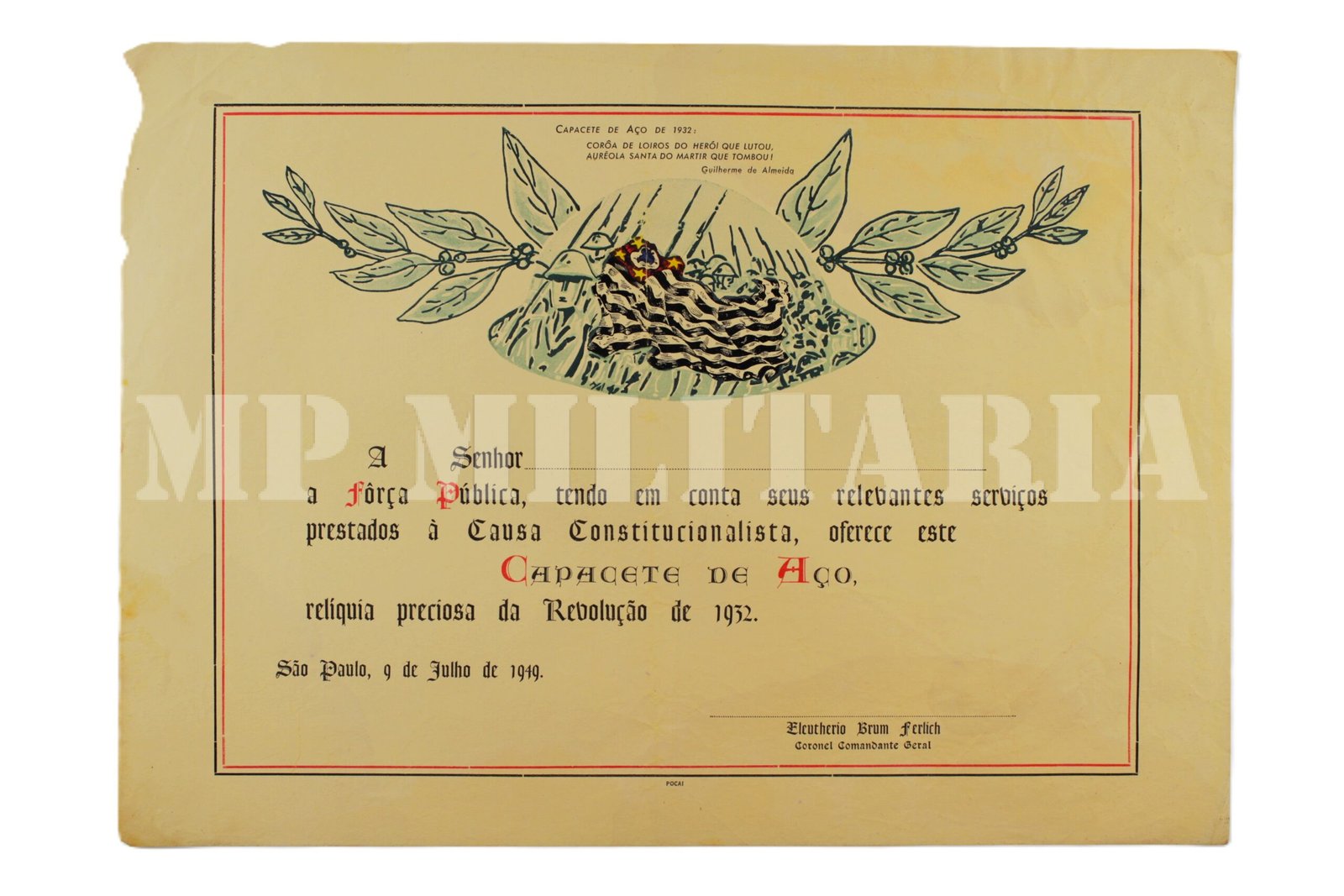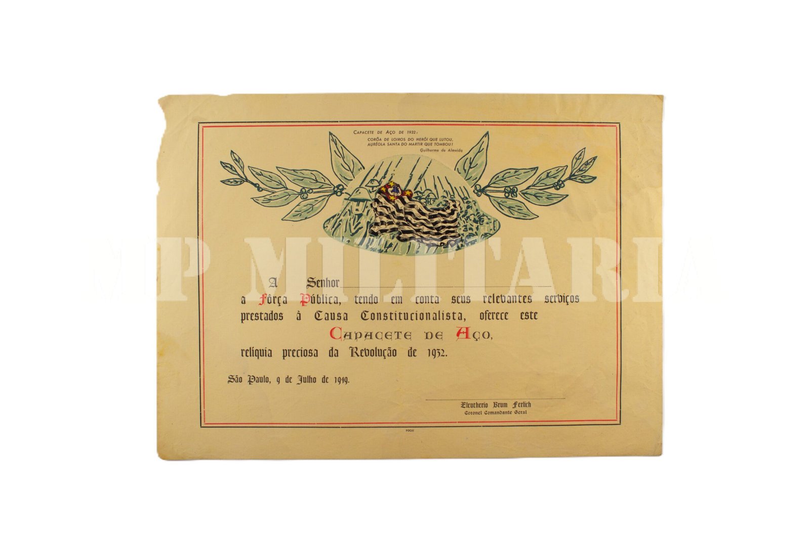 DIPLOMA DO CAPACETE DE AÇO DE 32 – FORÇA PÚBLICA DE SÃO PAULO