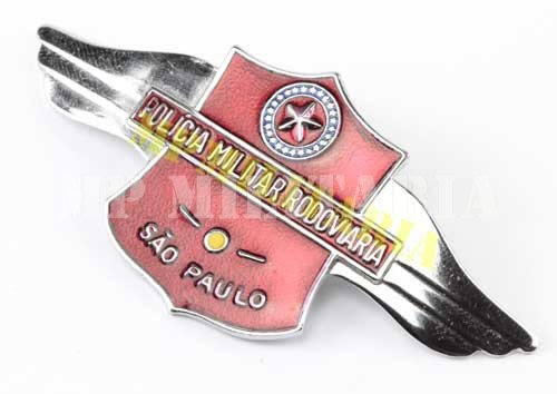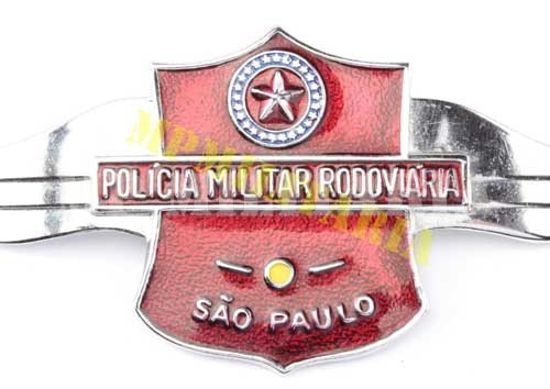 Distintivo da Polícia Militar Rodoviária de São Paulo PMESP, prateado e vermelho para Sub Tenentes e Sargentos, modelo de 1988 usado até 2013 quando mudou a inscrição de “Polícia Militar Rodoviária” para “Policiamento Rodoviária”.