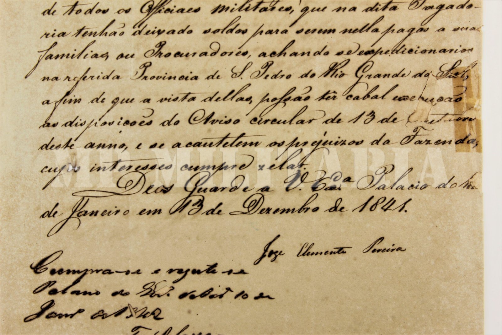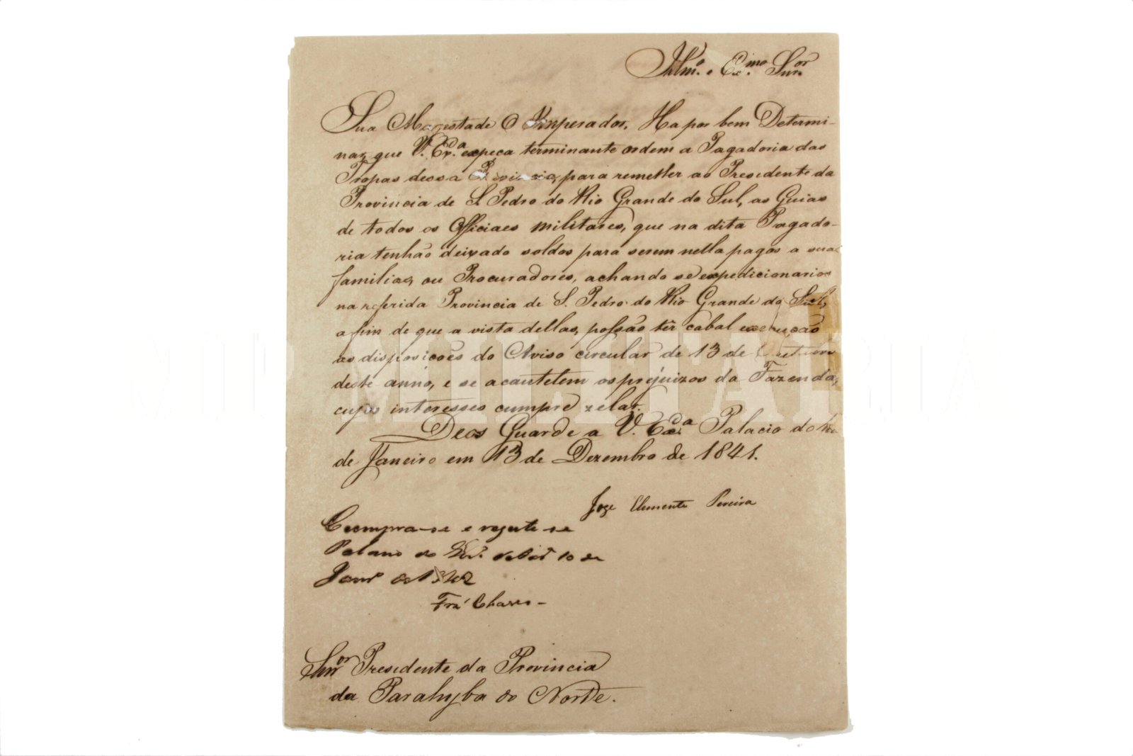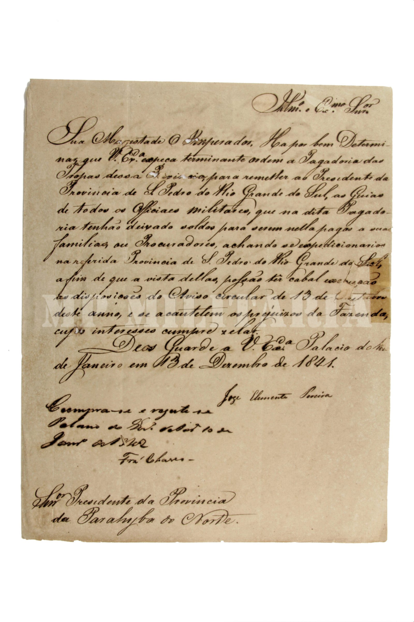 Documento Imperial ordem do Imperador D. Pedro II ao Presidente da Provincia da Parayba do Norte (Paraíba) ordenando o pagamento a Provincia de São Pedro do Rio Grande do Sul (Rio Grande do Sul) para pagamento das tropas imperiais atuando na Guerra dos Farrapos (1835 – 1845). O documento é assinado pelo então Ministro da Guerra José Clemente Pereira (1787 – 1854) em 1841 e pelo Presidente da Provincia da Parayba do Norte Pedro Rodrigues Fernandes Chaves – Barão de Quaraim (1810 – 1866);