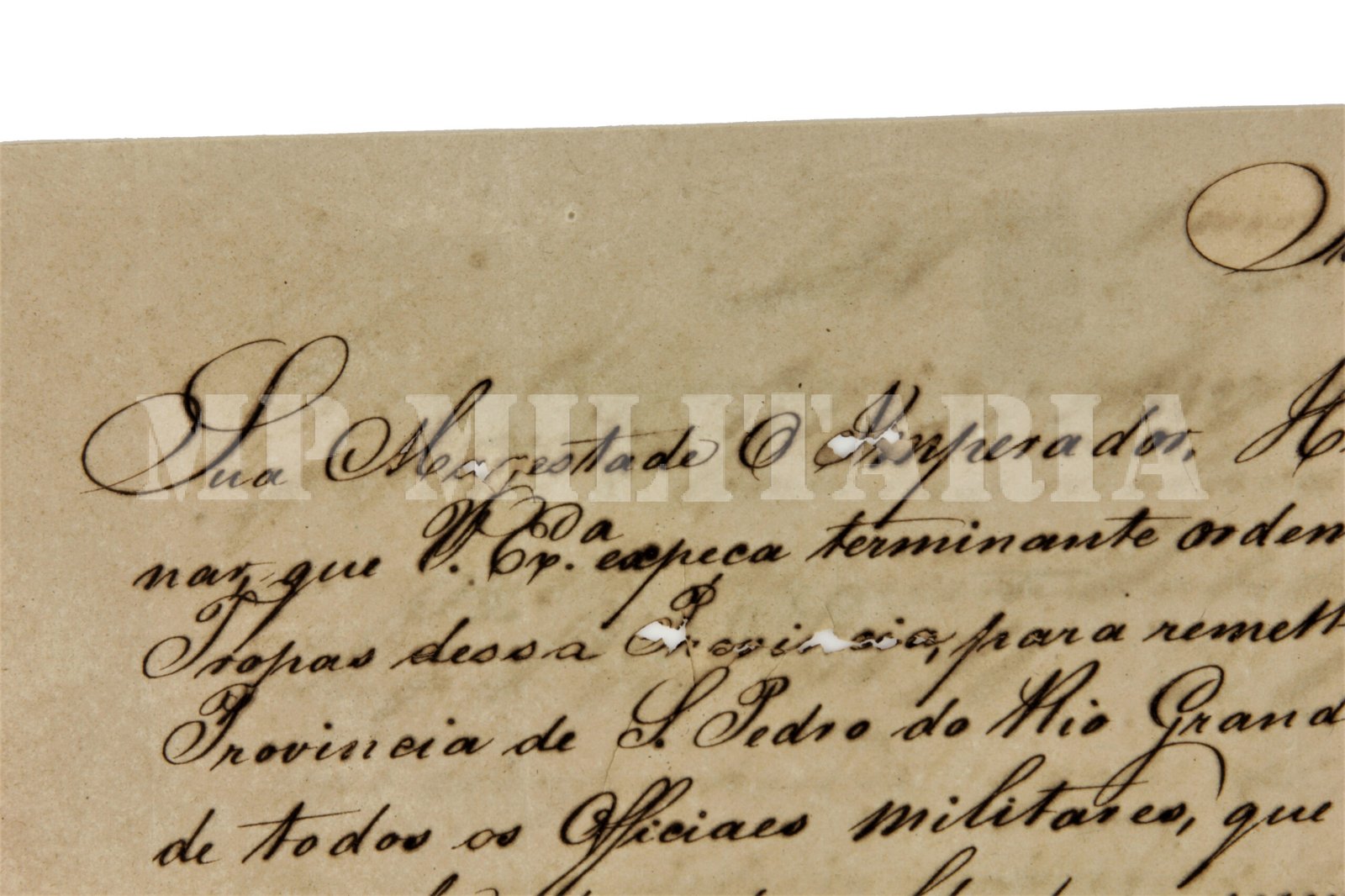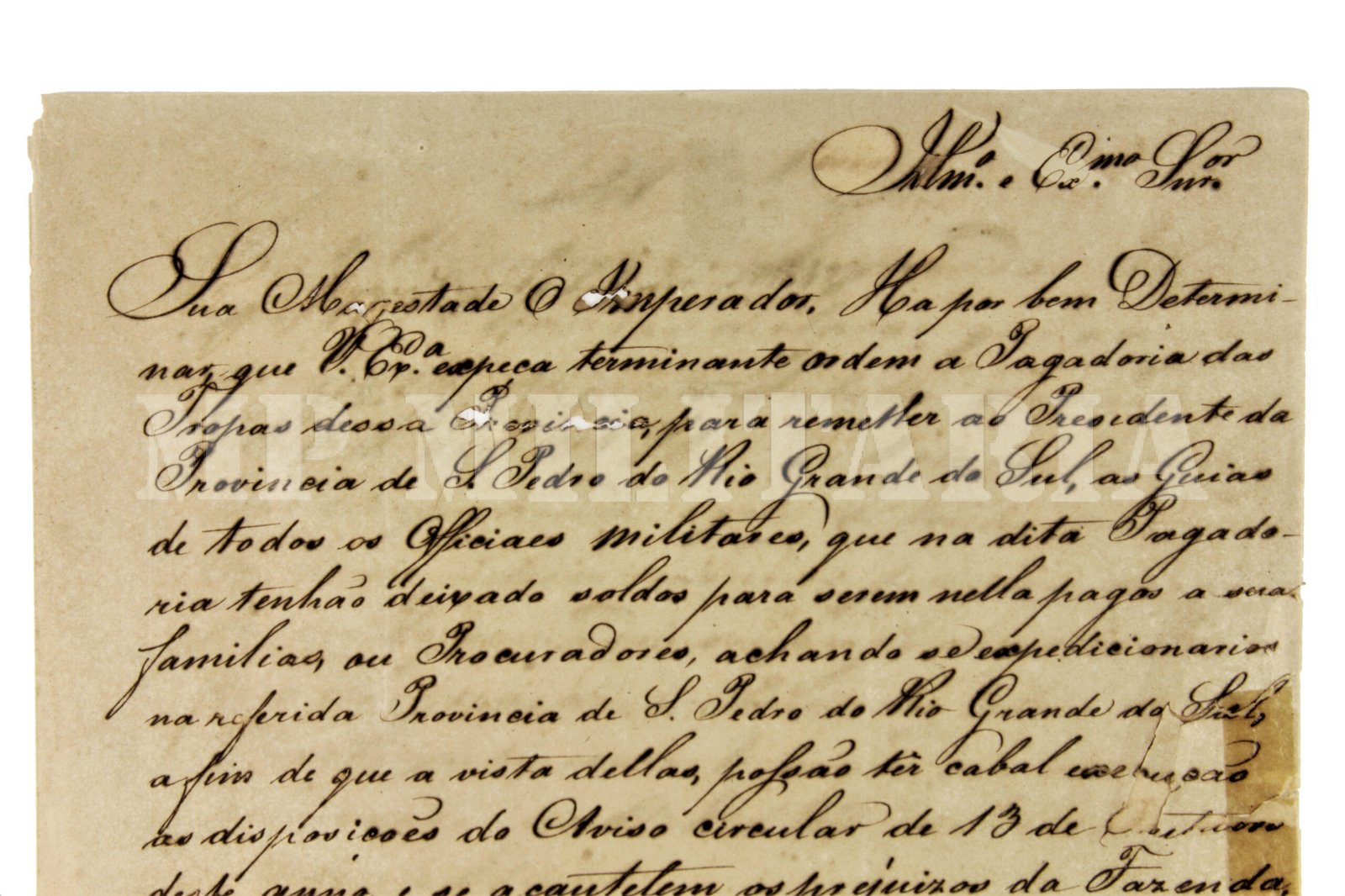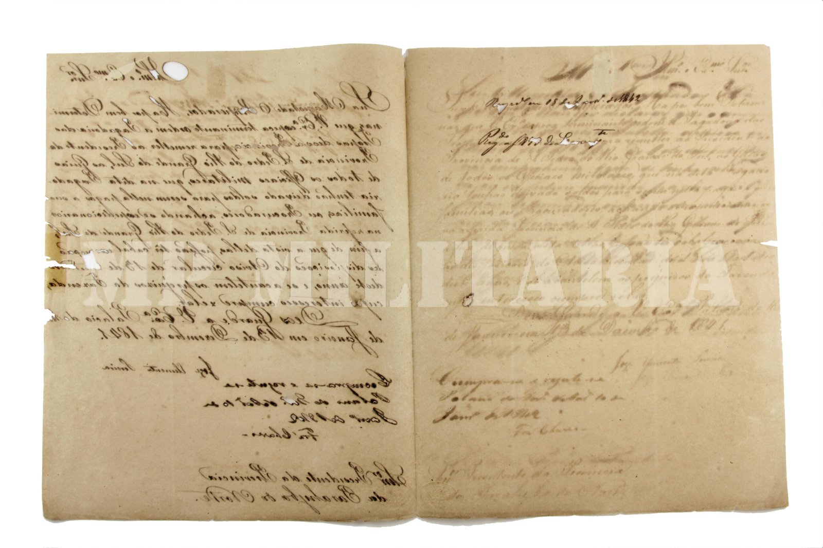 Documento Imperial ordem do Imperador D. Pedro II ao Presidente da Provincia da Parayba do Norte (Paraíba) ordenando o pagamento a Provincia de São Pedro do Rio Grande do Sul (Rio Grande do Sul) para pagamento das tropas imperiais atuando na Guerra dos Farrapos (1835 – 1845). O documento é assinado pelo então Ministro da Guerra José Clemente Pereira (1787 – 1854) em 1841 e pelo Presidente da Provincia da Parayba do Norte Pedro Rodrigues Fernandes Chaves – Barão de Quaraim (1810 – 1866);