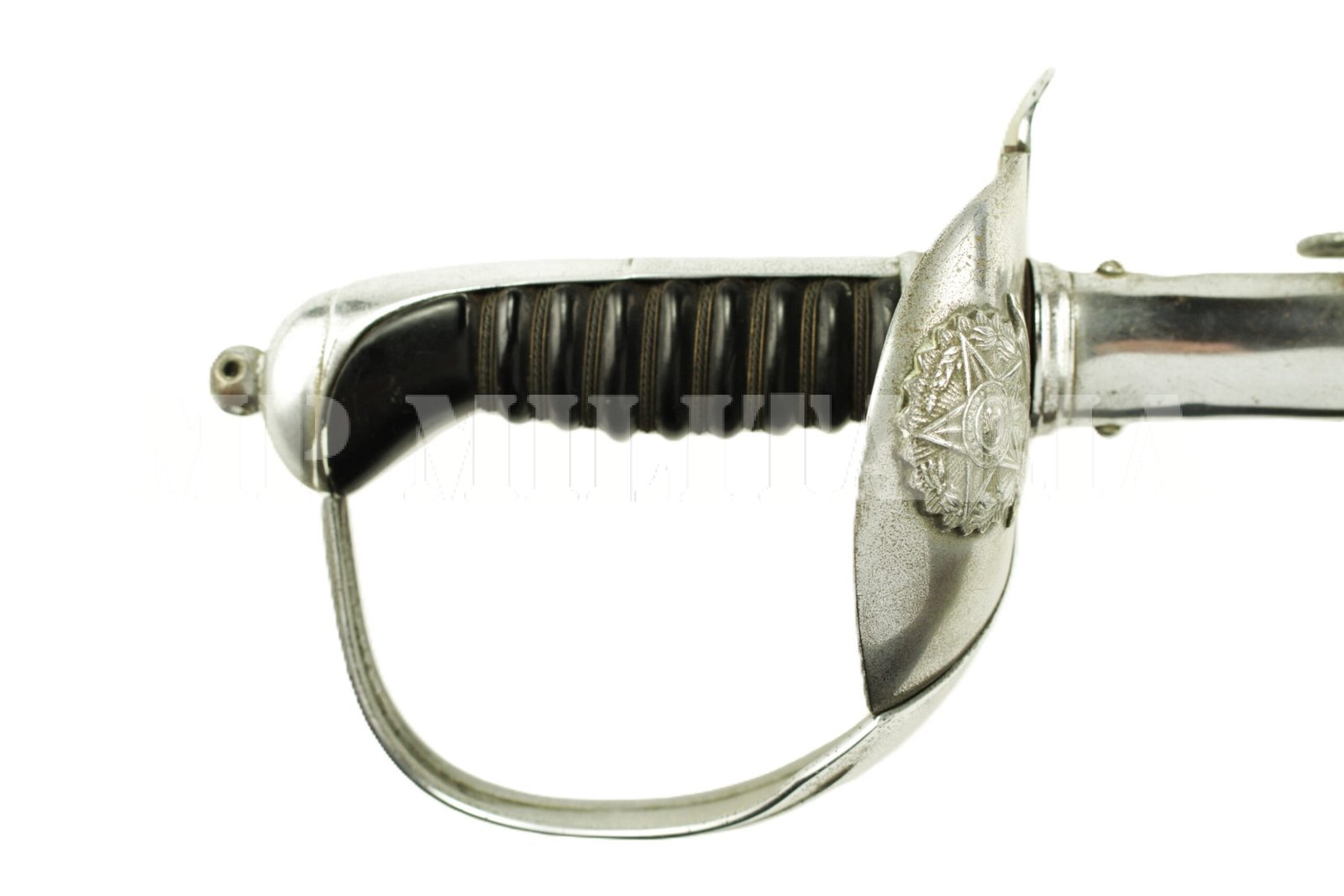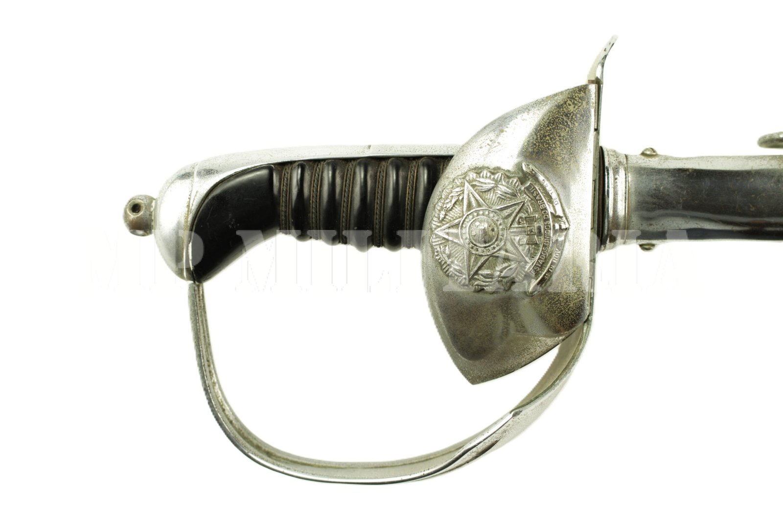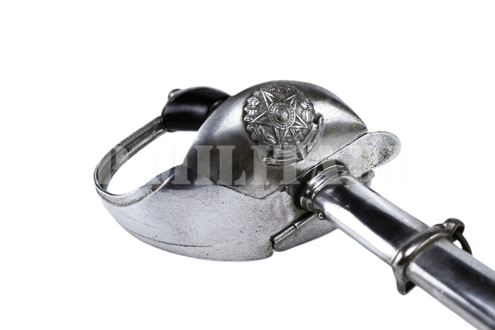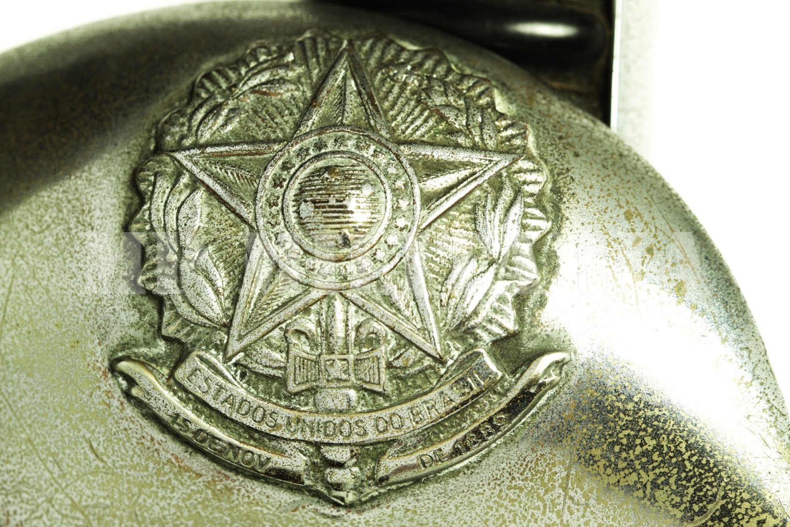 Antiga espada de oficial do Exército Brasileiro. Apresenta a Inscrição “Estados Unidos do Brasil” e vinte e uma estrelas no brasão das armas, guarda retrátil;