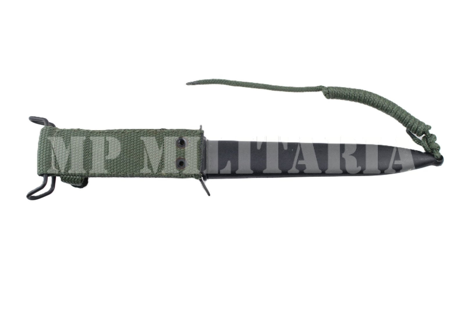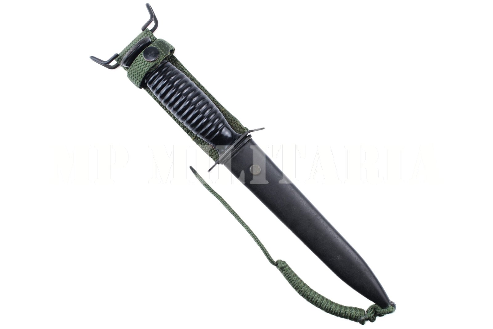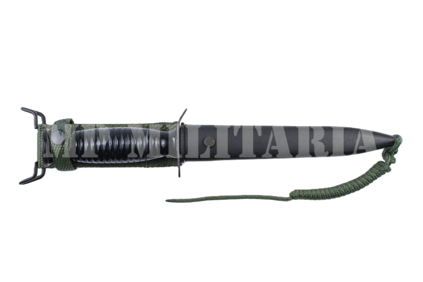 Cabo de baquelite, lâmina de aço baixa visibilidade e bainha plástica;