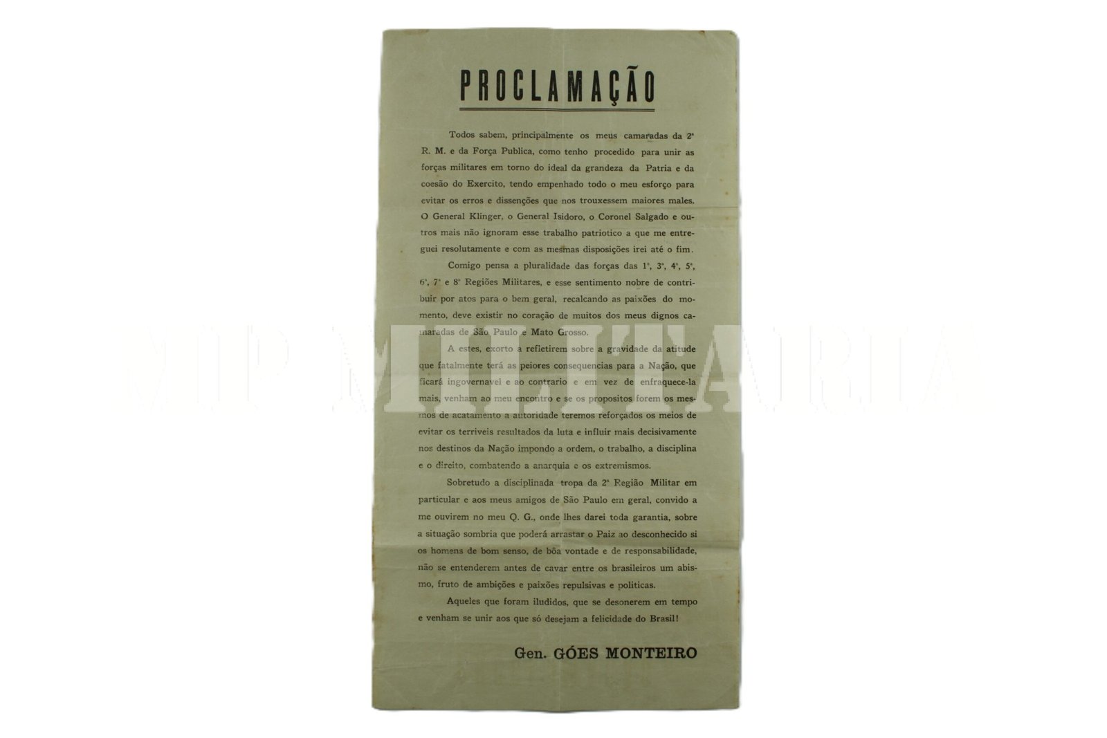 Panfleto “Proclamação” do General Góes Monteiro, que tenta dissuadir a Força Pública de São Paulo e a 2ª Região Militar, em tom de ameaça, impresso pelo governo federal no começo da Revolução Constitucionalista de 1932;