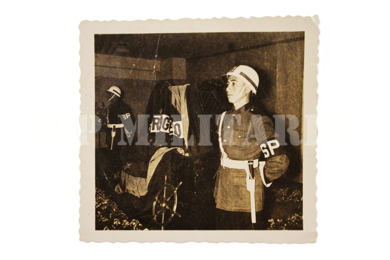 Antiga fotografia de uma guarda de honra de dois policiais do Serviço de Polícia – SP da Marinha do Brasil, a uma bandeira brasileira;