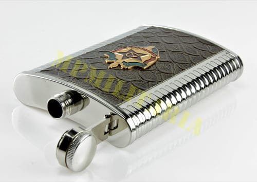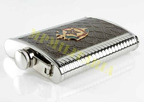 Garrafa de bolso para vodka / whisky da extinta União Soviética, com o badge da KGB;