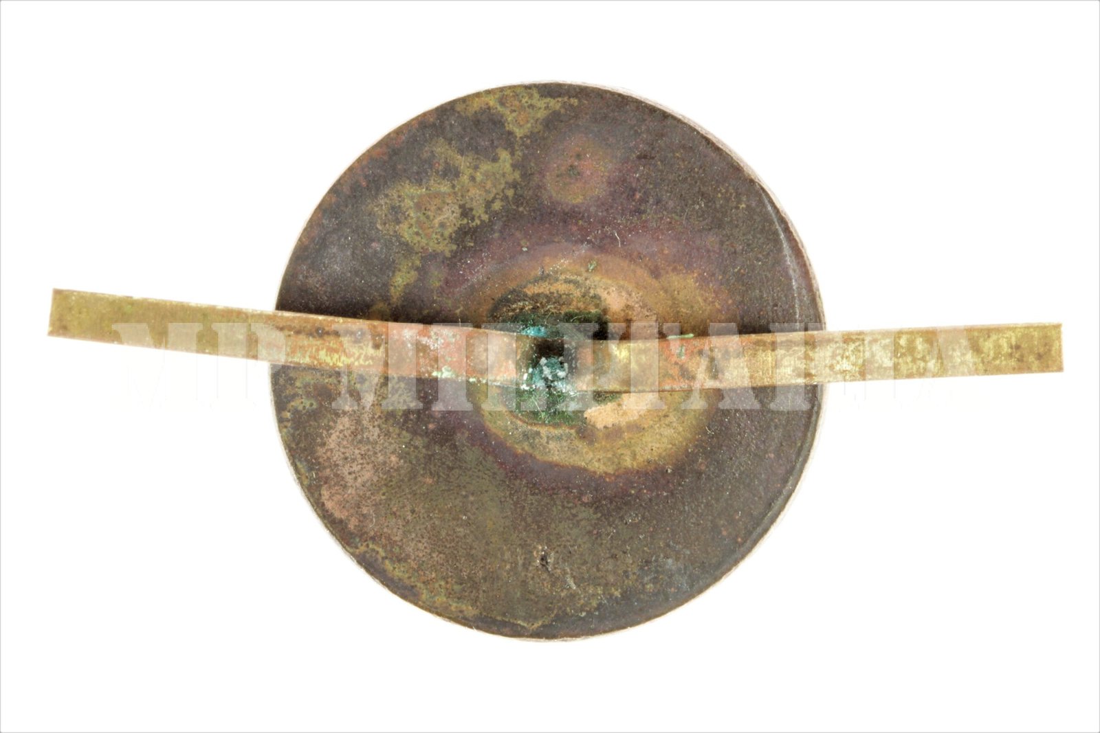 Antiga insígnia Tope da arma de Infantaria para o quepe de oficial do Exército Brasileiro nos anos 30/40, cor classificada como “Verde Nacional” no RUPE (Regulamento de Uniformes do Pessoal do Exército) de 1942, mesmo modelo usado por oficiais da FEB – Força Expedicionária Brasileira;