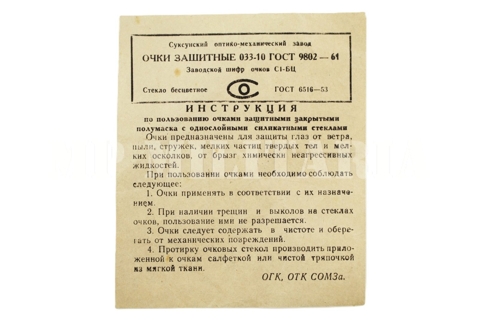 Instrução dos óculos de voo 033-10, usado por pilotos e tripulações da Força Aérea da extinta União Soviética;