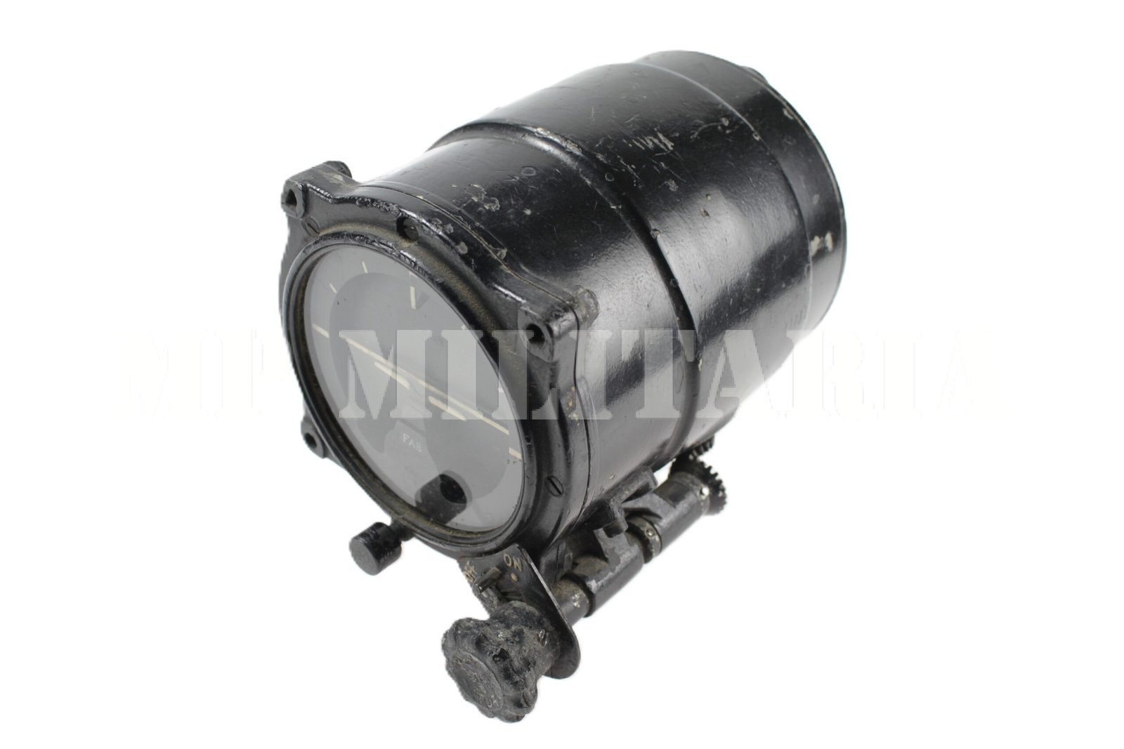 Instrumento do Caça P-47, indicador giroscópio de horizonte, tipo AN-5736-1, com a marca da FAB – Força Aérea Brasileira no visor;