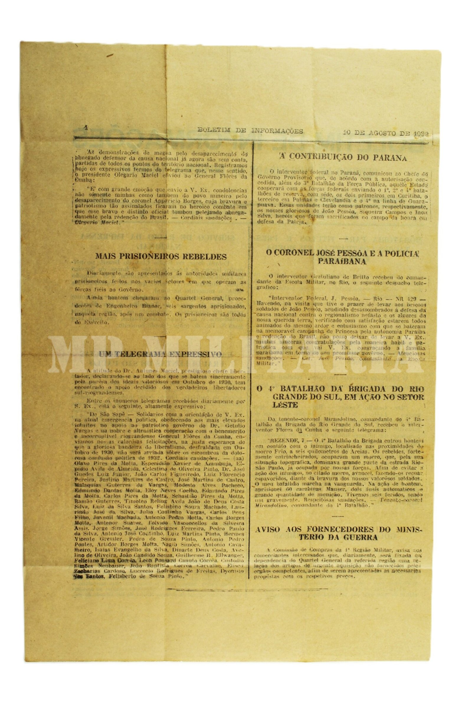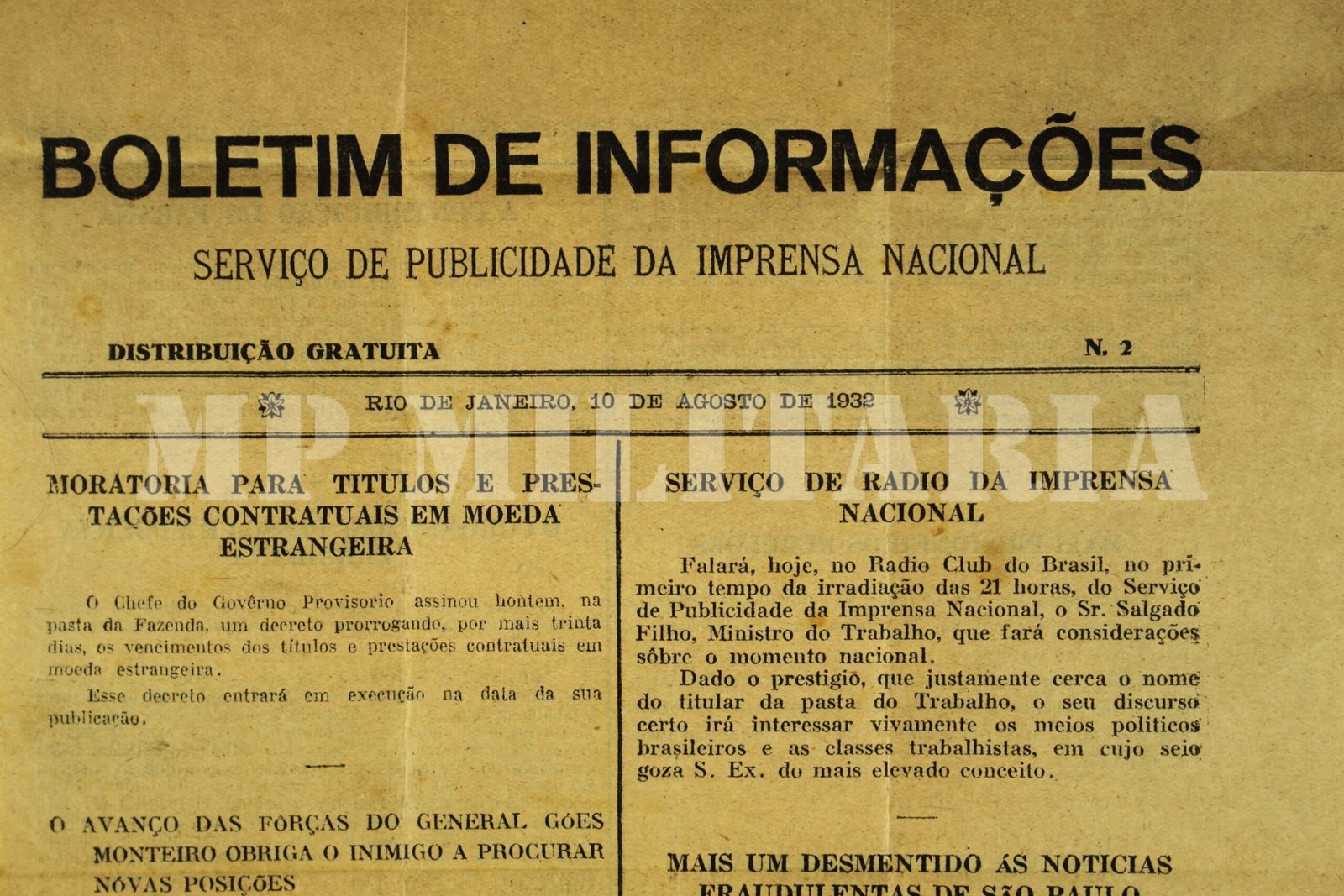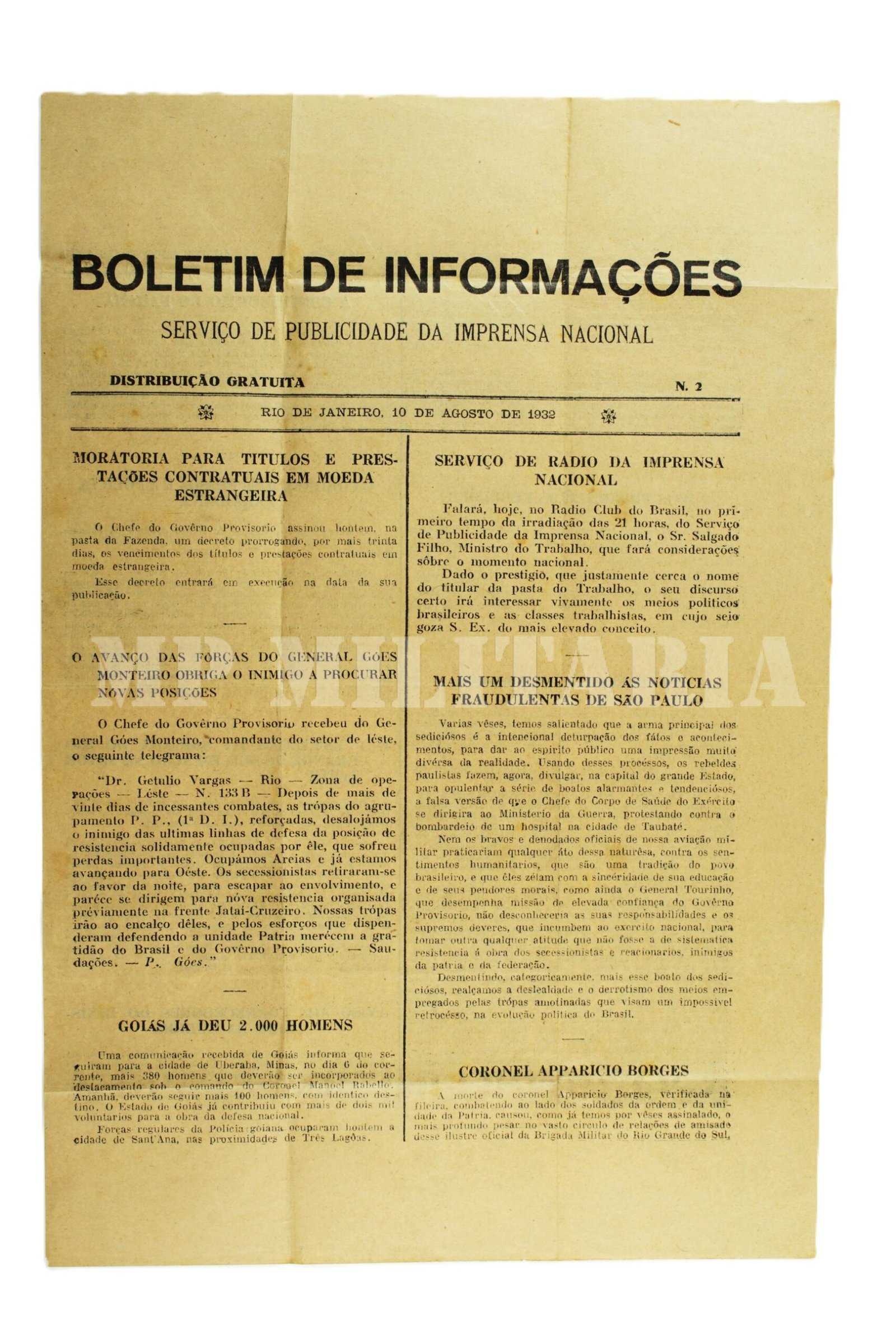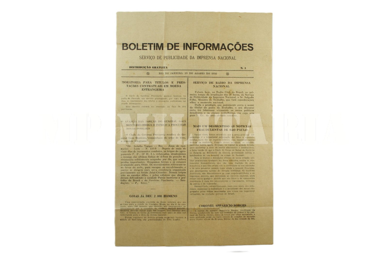 Jornal “Boletim de Informações” número 3, publicado em 10/08/1932 no Rio de Janeiro, pelo Serviço de Publicidade da Imprensa Nacional, com informações das movimentações das tropas federais, propaganda contra o Governo Constitucionalista de São Paulo;