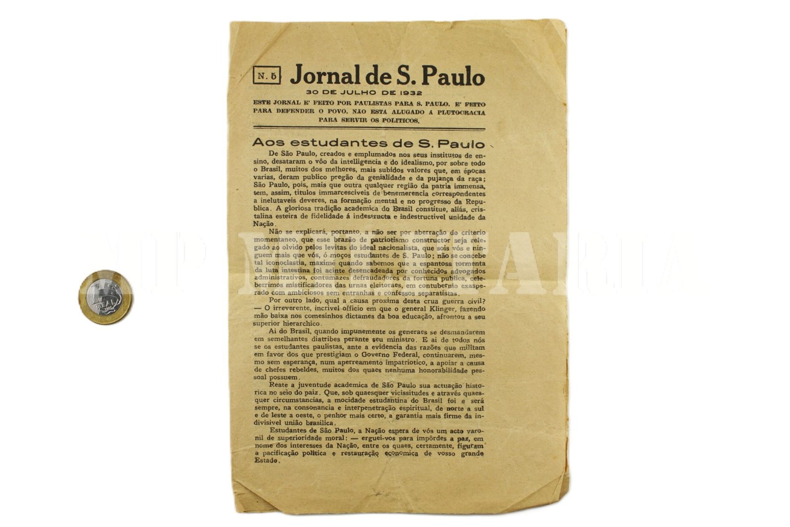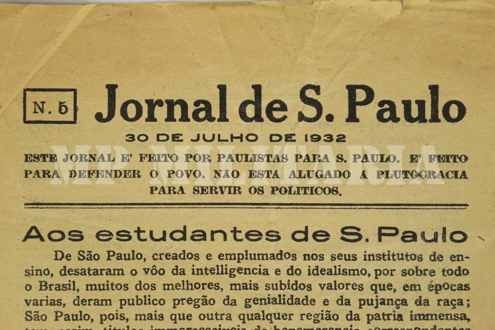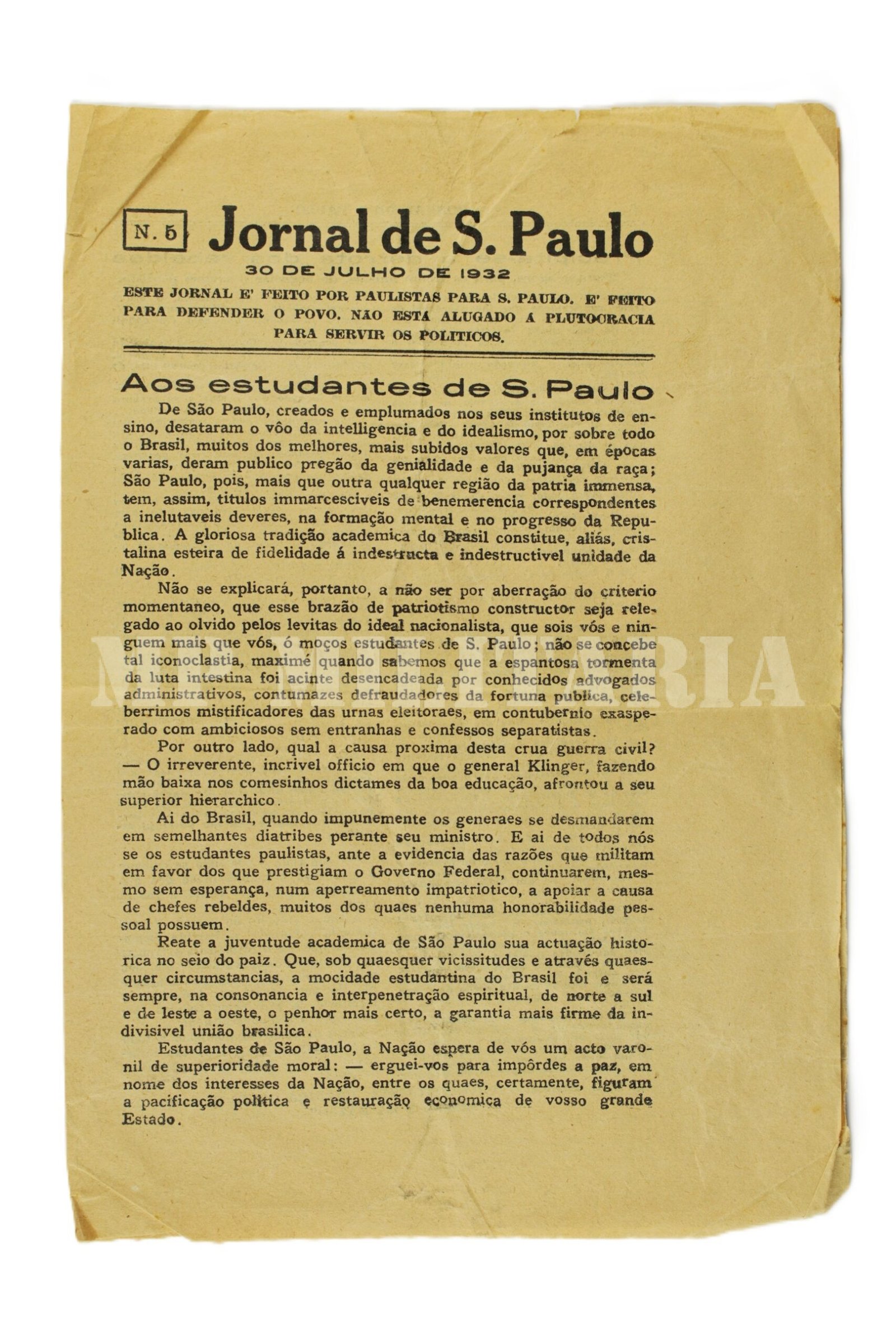 Jornal de São Paulo, de contrainformação do Governo Federal, para desmotivar a população paulista a aderir ao movimento revolucionário, publicado durante a Revolução Constitucionalista de 1932, número 5, de 30 de julho de 1932;