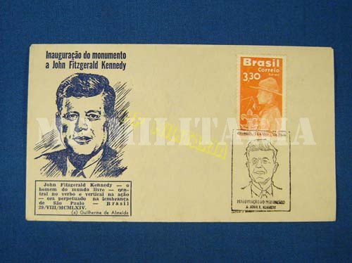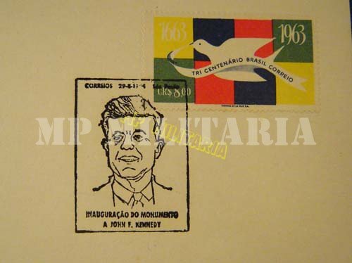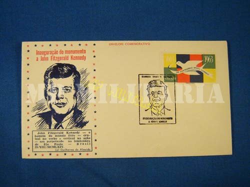Lote de 2 Envelopes e selo brasileiro “Inauguração do Monumento a John Fitzgerald Kennedy” com Flâmulas filatélicas – 1964