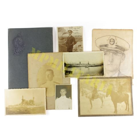 Lote de fotos e caricatura de um Oficial da Marinha do Brasil dos anos 1910 e 20, com cartões de navios de guerra;
