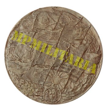 Reverso: Entre uma coroa de carvalho e louros uma formação de bandeiras dos países aliados e abaixo sobre um gládio embainhado a efígie da Medusa.