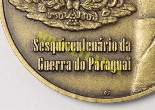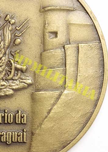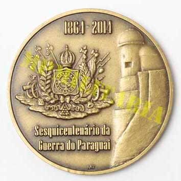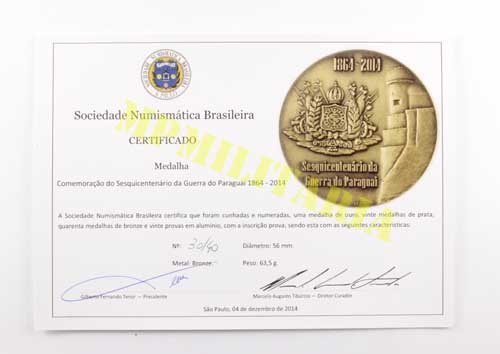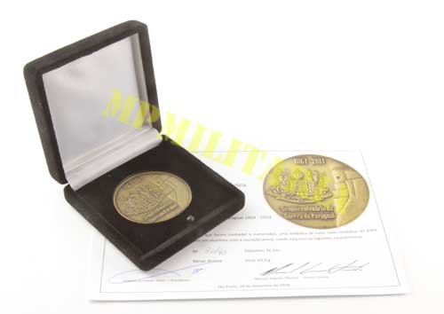 Medalha comemorativa do Sesquicentenário da Guerra do Paraguai 1864 / 2014, ∙ Forte Coimbra, feita pela SNB – Sociedade Numismática Brasileira e lançada em 04 de dezembro de 2014 no XVIII Congresso Brasileiro de Numismática, em comemoração aos 150 anos da Guerra do Paraguai. A guerra teve inicio com o ataque do Forte Coimbra em 26 de dezembro de 1864. Foram cunhadas apenas uma (1) medalha de ouro, vinte (20) medalhas de prata, quarenta (40) de bronze e vinte (20) provas em alumínio, as medalhas foram numeradas a anunciada é de numero 30 / 40. Acompanha certificado da SNB.