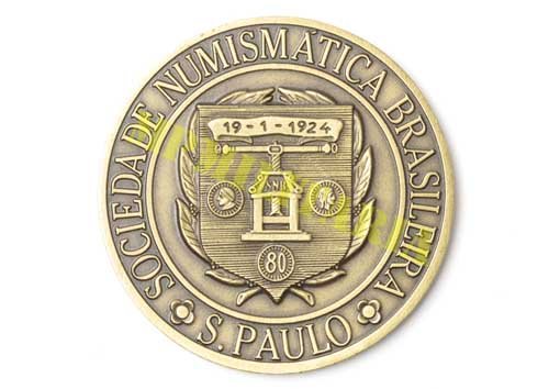 Apresenta o brasão da Sociedade Numismática Brasileira.