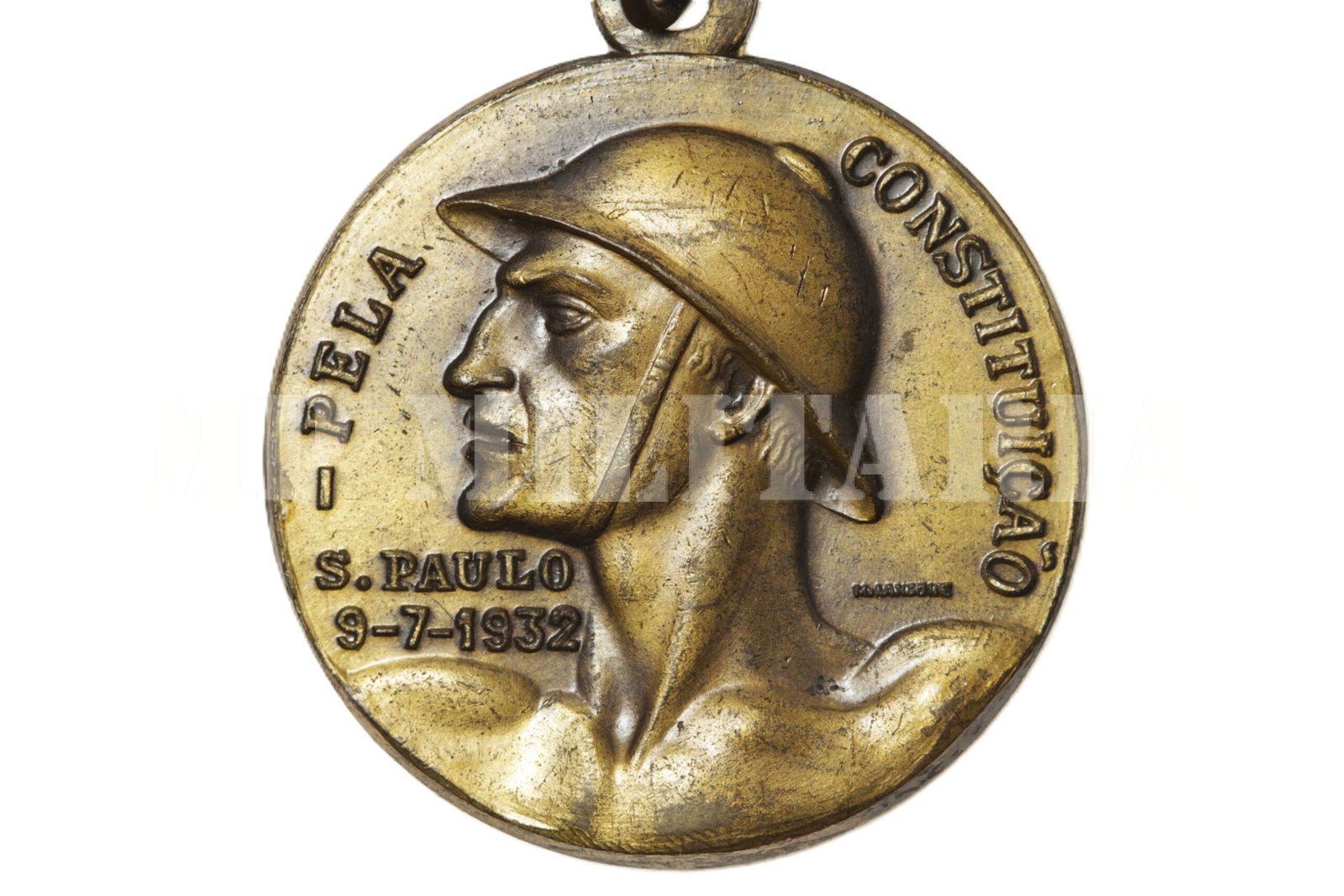 A mais conhecida medalha da Revolução de 1932 “Pela Constituição – São Paulo é o Direito a Força” com fita. Esta medalha foi cunhada durante a Revolução Constitucionalista de 1932;