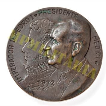 Medalha da Taça Independência do Brasil nas comemorações do Sesquicentenário da Independência do Brasil 1822 – 1972, apresenta as efígies do Presidente Emilio Garrastazu Médici e o Imperador D. Pedro I;