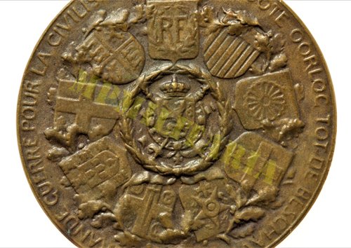 Reverso: No centro entre louros as armas da Bélgica e nove brasões de outros países entre eles o do Brasil e na orla a inscrição em francês e flamengo “La Grande Guerre pour la Civilisation / De Croote Oorloc Tot de Beschavinc”;