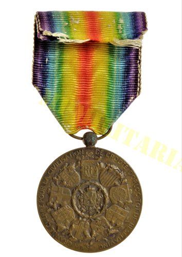 Medalha da Vitória Belga “Inter-Aliada” da I Guerra, 1º modelo assinado pelo artista Paul Dubois Mundial, apresenta o brasão das Armas do Brasil entre outros países. Medalha Inter-Aliada foi sugerida pelo Marechal Foch (francês) e denominada “Grande Guerra Pela Civilização”;