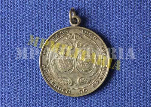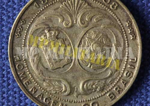 Reverso: Armas do Brasil e Portugal e a inscrição: “1809 1908 – Homenagem do Brasil”.