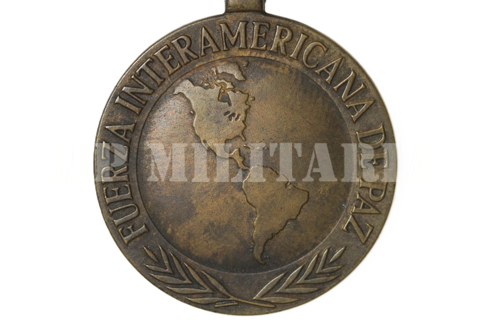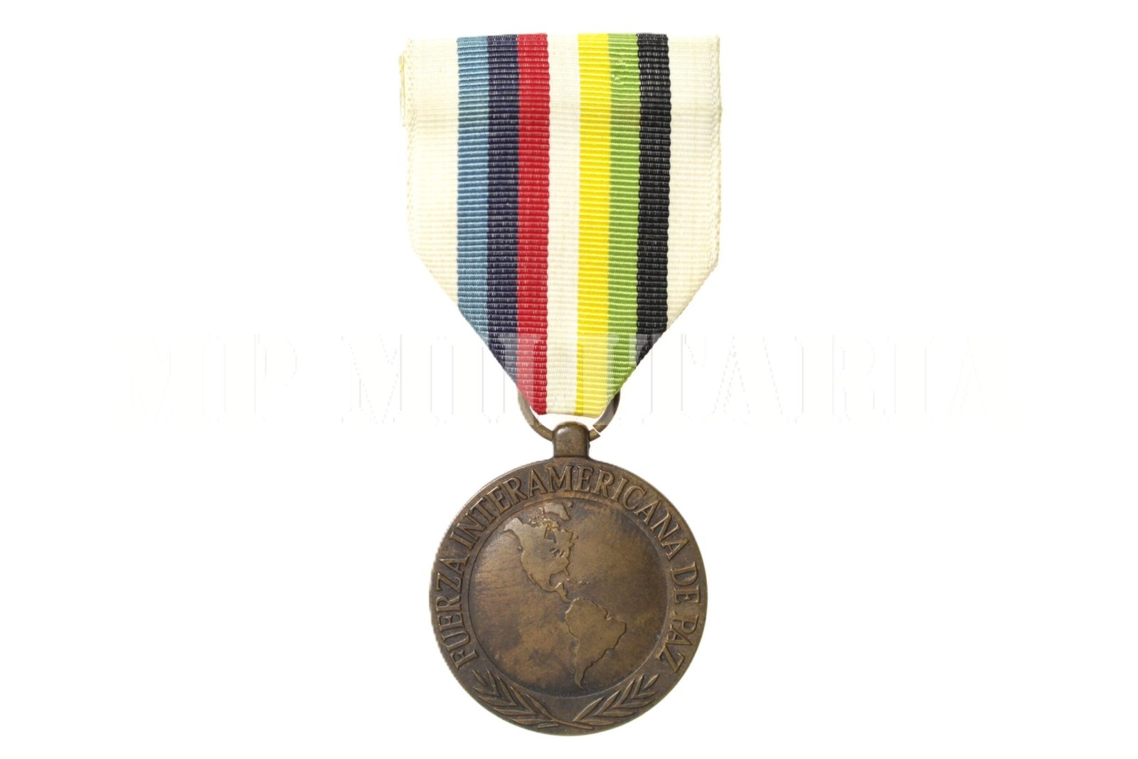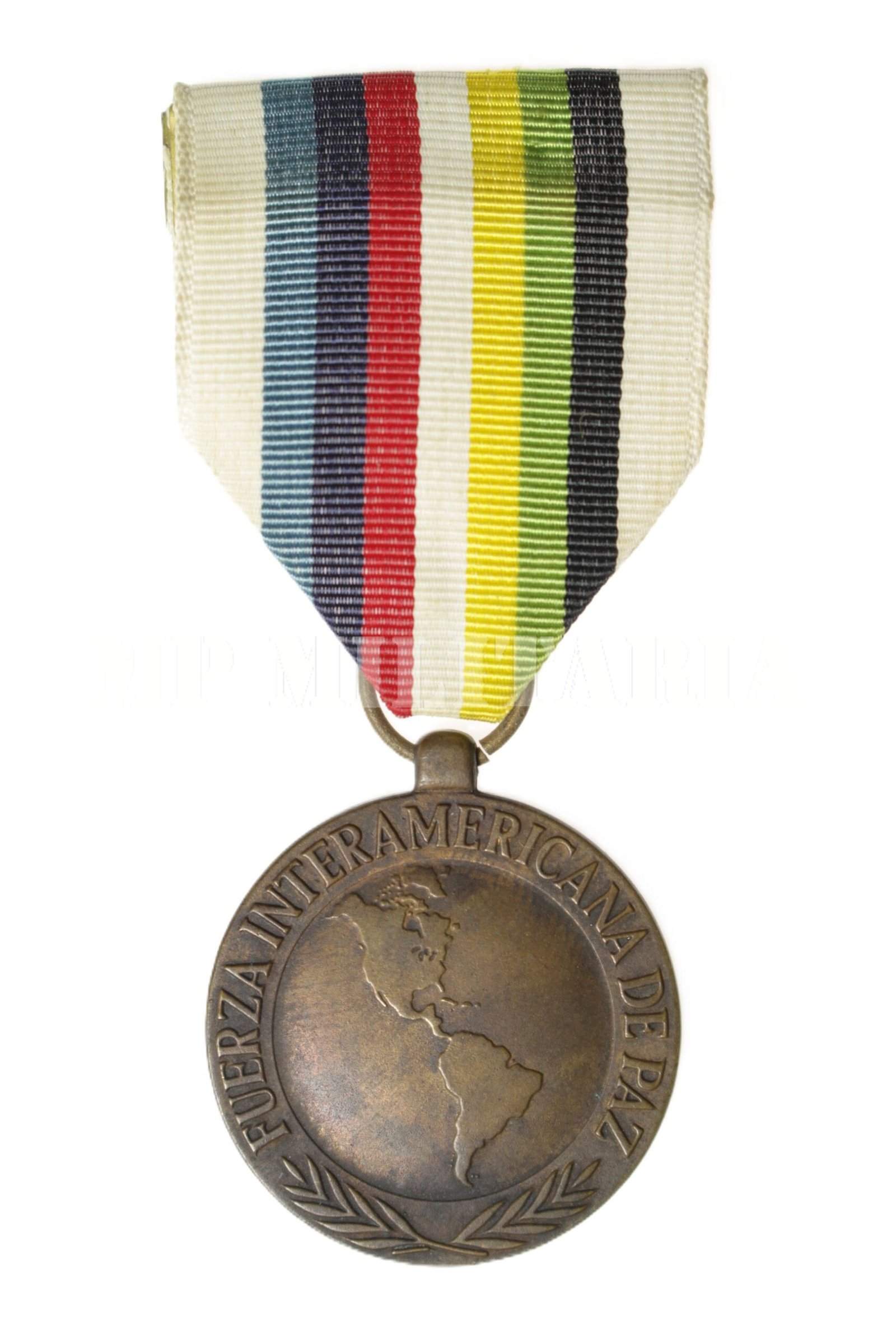 No campo a América, na orla palmas e a inscrição: “Fuerza Internacional de Paz”;