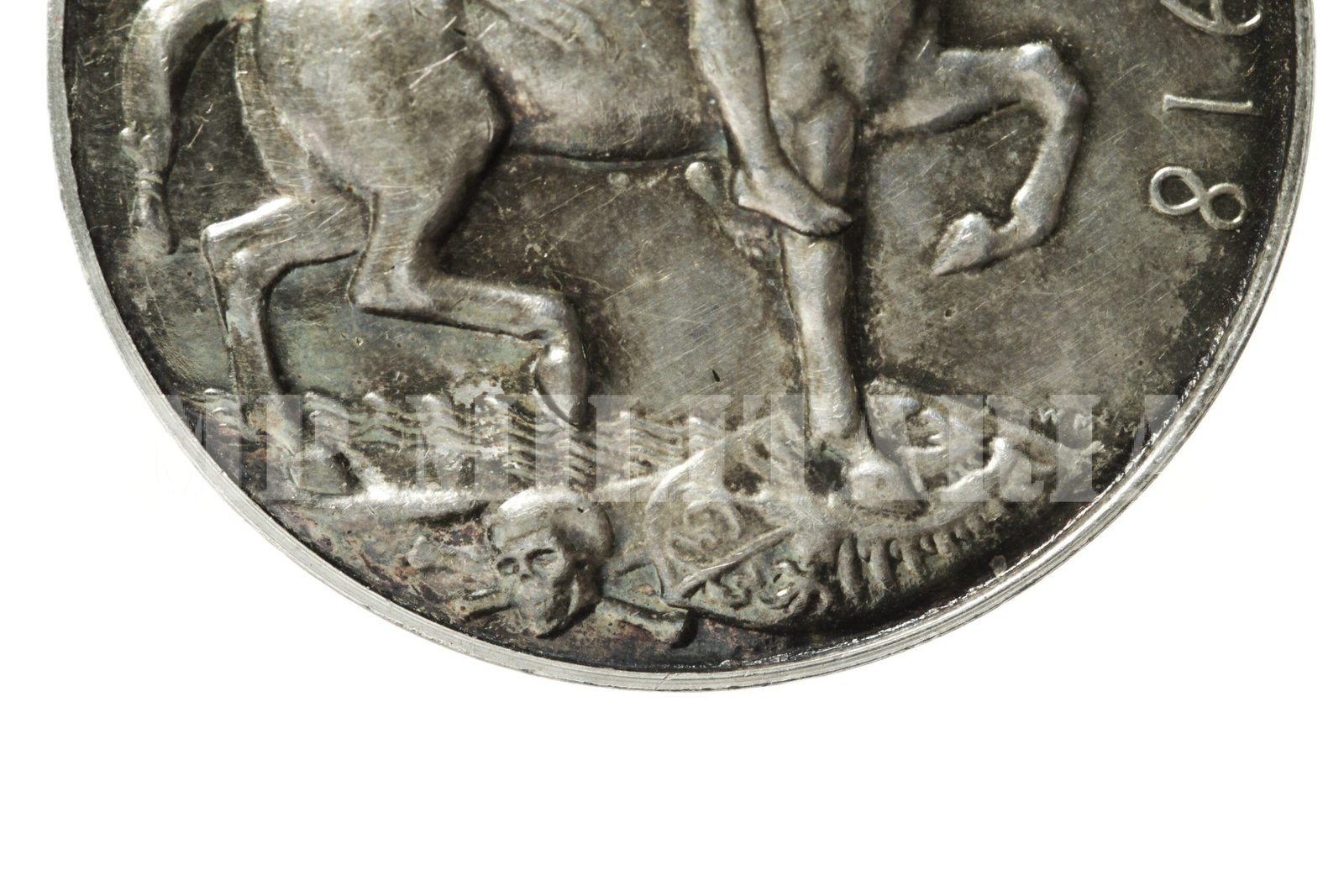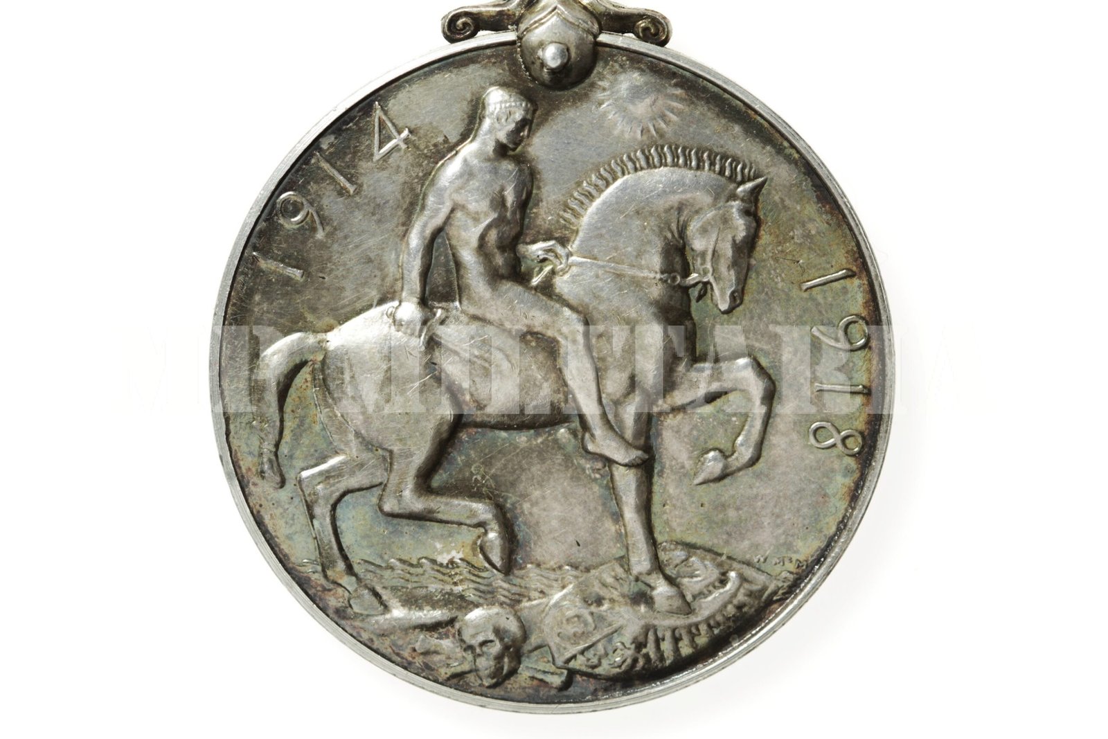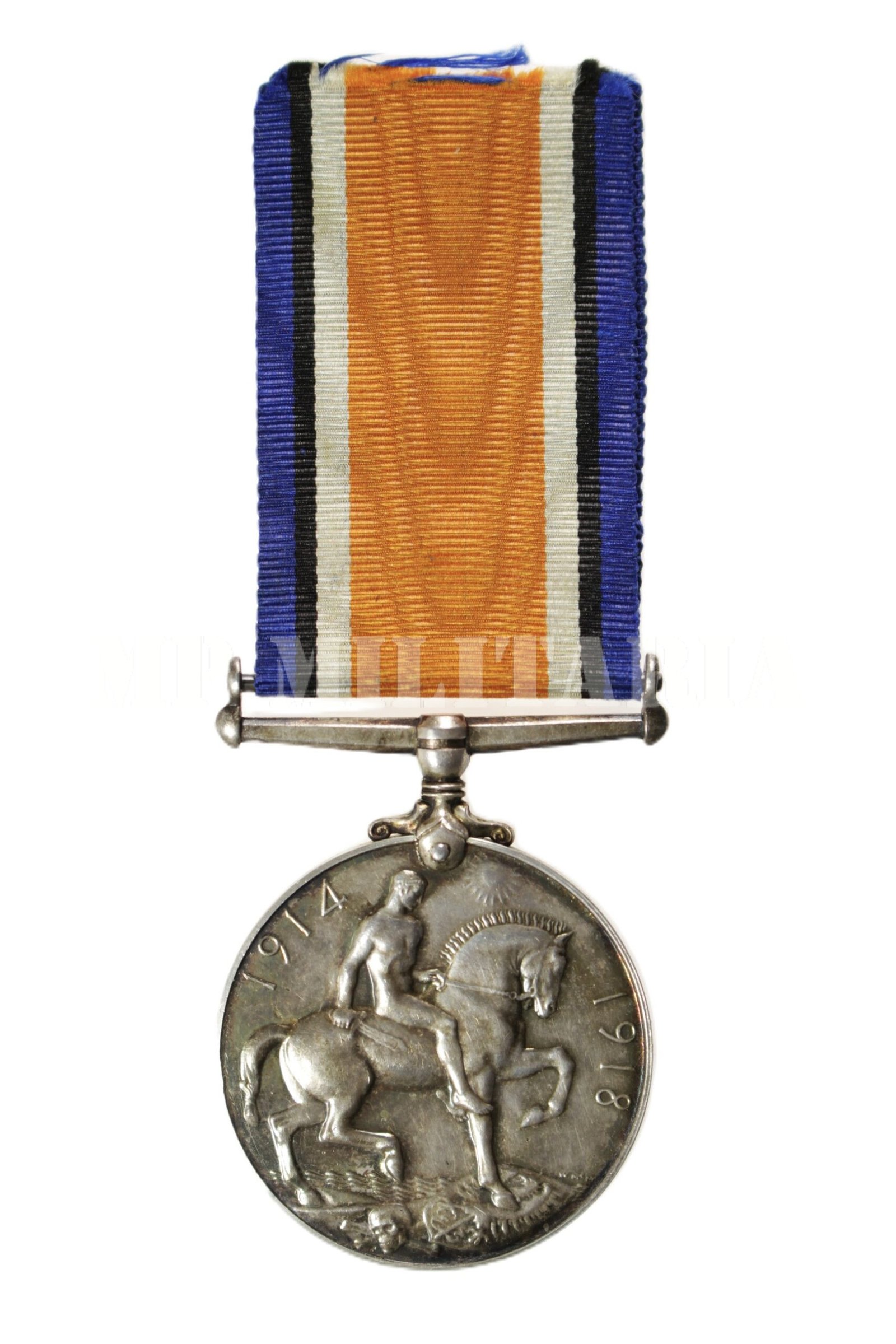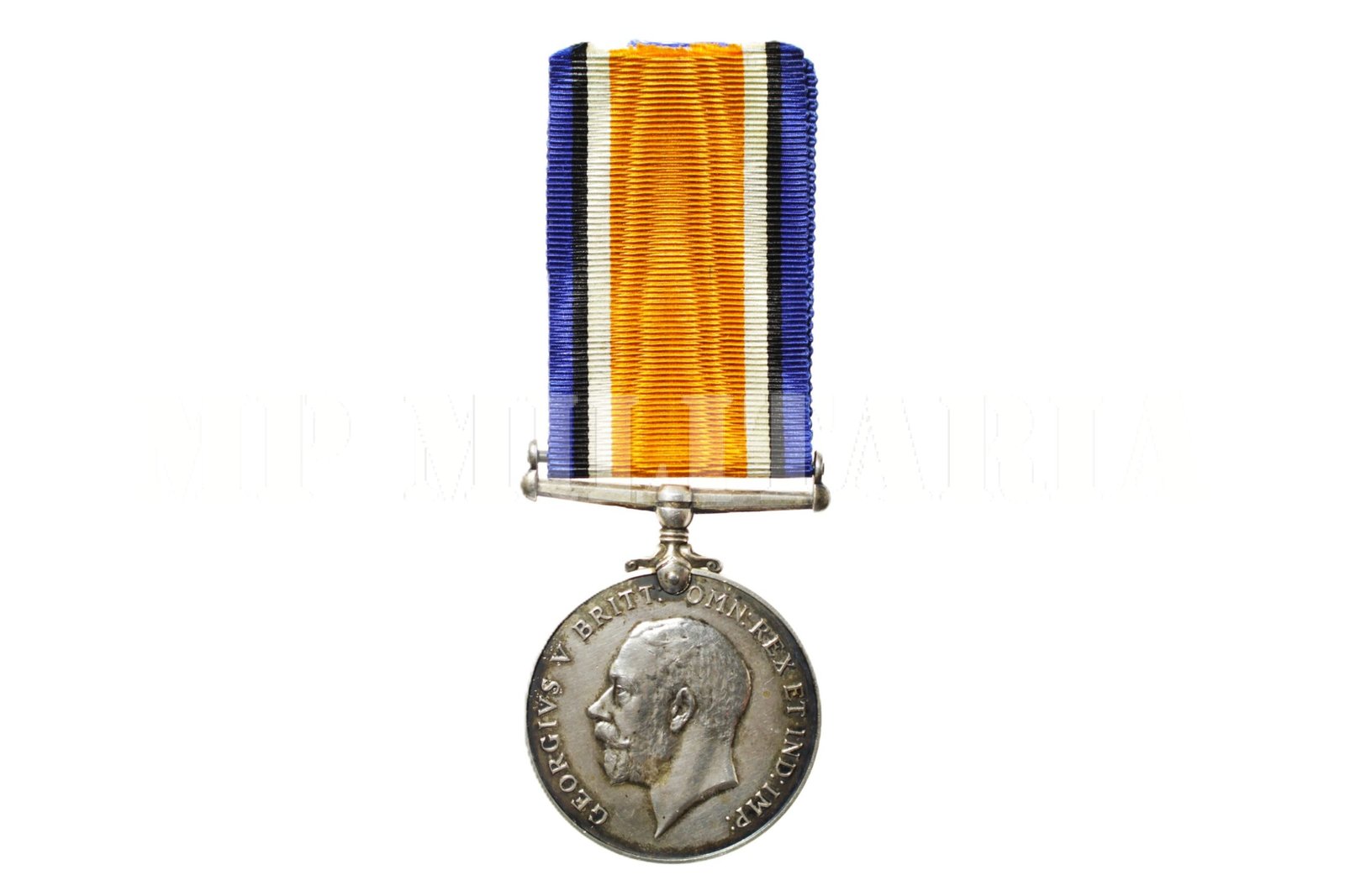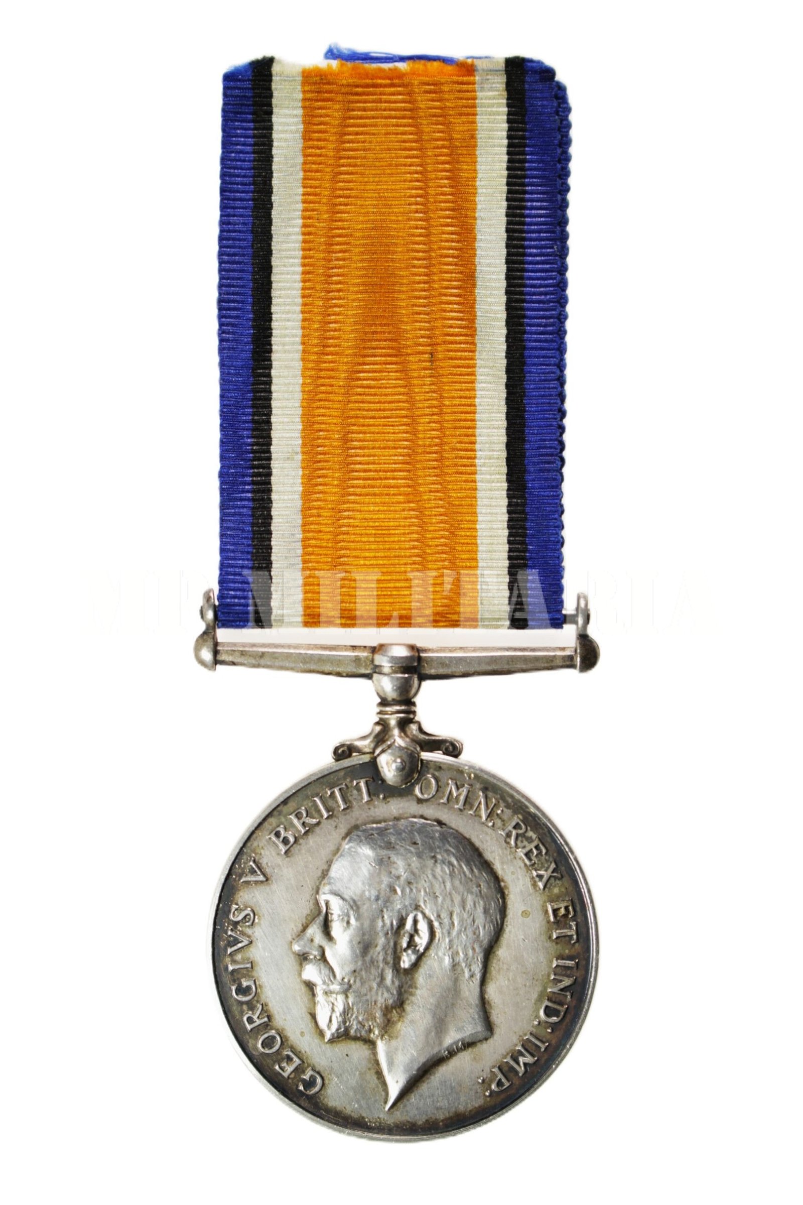 Medalha de Guerra Britânica 1914 – 1918, “British War Medal 1914-1920”, de um Soldado do Corpo Médico do Exército Real Royal (R.A.M.C. – Royal Army Medical Corps), apresenta gravado no bordo o número, patente, nome e unidade, (61142, Pte L.F. Bartlett, R.A.M.C.) do Militar, concedida a militares que participaram da I Guerra Mundial;