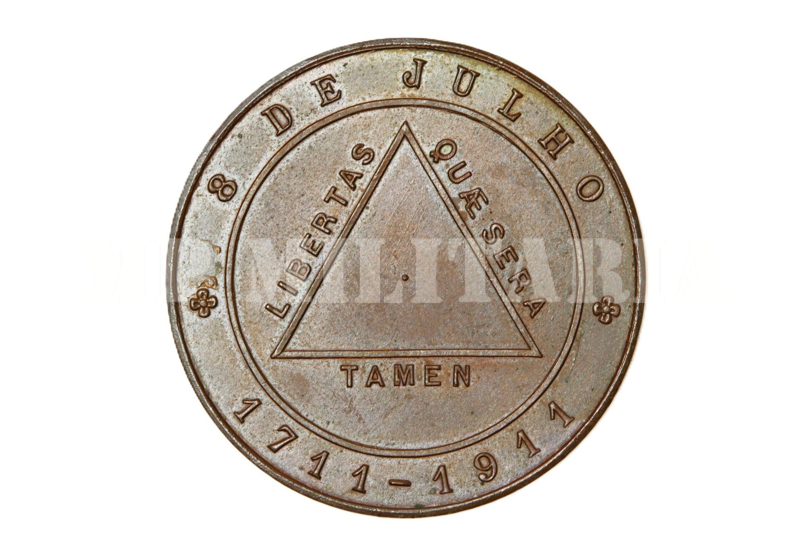 No centro o símbolo de Minas Gerais e da inconfidência, na orla a inscrição “8 de julho ∙ 1711 – 1911”;