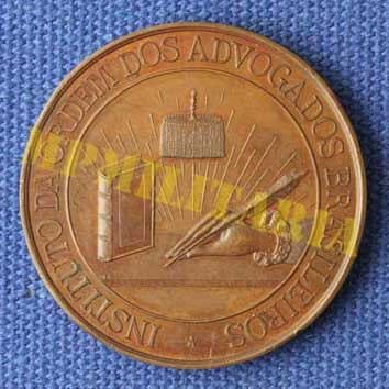 Anverso: No centro radiante um capelo sobre um livro e uma mão escrevendo com uma pena e na orla a inscrição: “Instituto da Ordem dos Advogados do Brasil”.